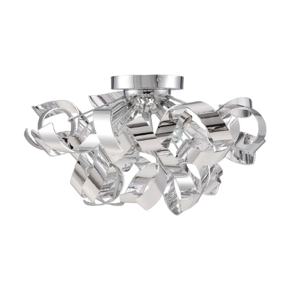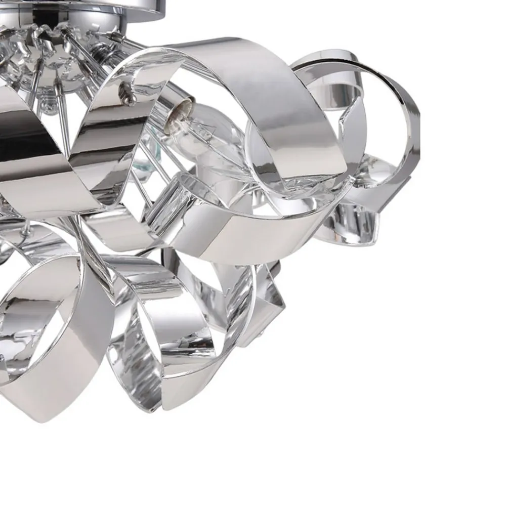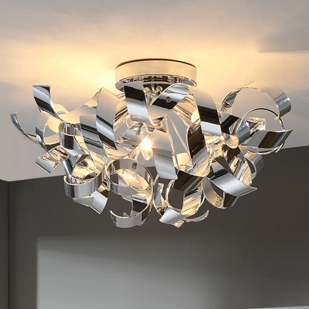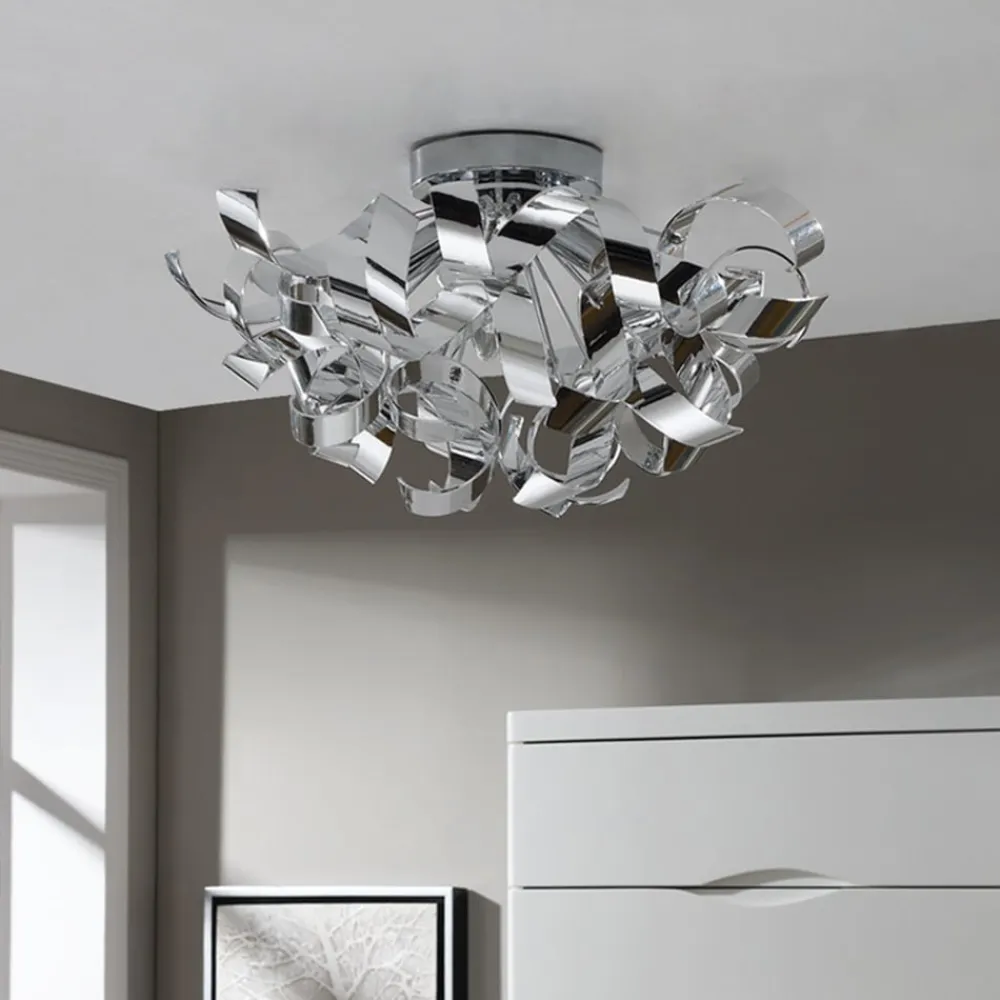 Skinnende krom loftlampe Elviro med et flot udseende Loftlampen Elviro består af smukt snoede plastbånd, der minder om sløjfer, som du måske genkender som en smuk dekoration fra gaveindpakning. Loftlampens elegante effekt forstærkes af, at overfladen på plastbåndene er helt forkromet og derfor udstråler en masse glans og storhed. E14-fatningerne, som kan monteres med alle typer pærer, er placeret nær loftbeslaget, og når de er tændt, skaber skærmens reflekterende overflade smukke funklende effekter.