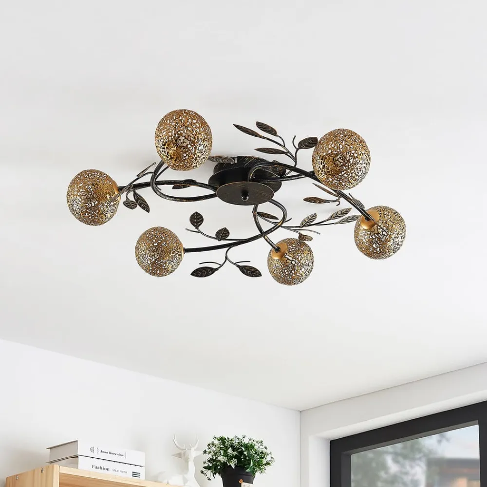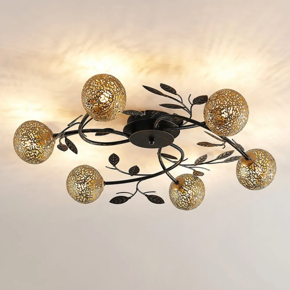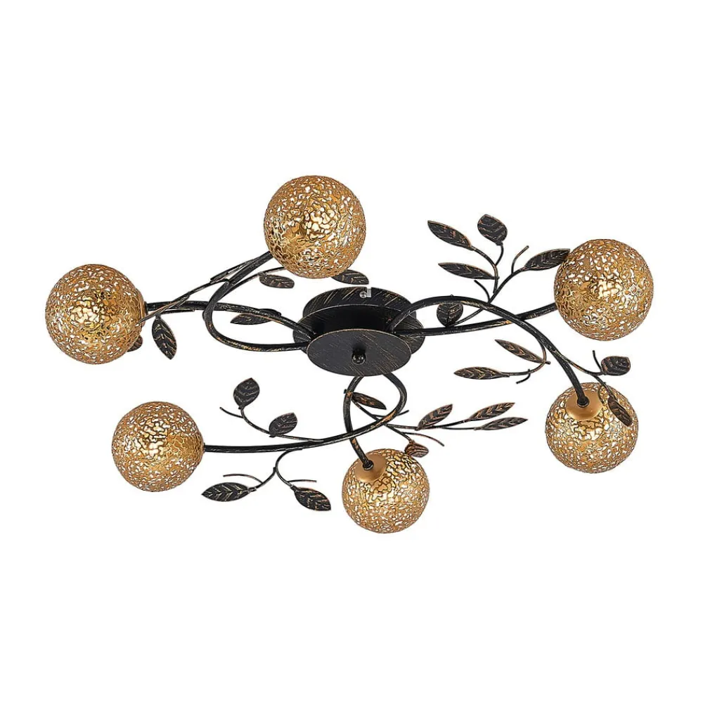 Evory loftlampe kombinerer blomster og orientalske elementer for at skabe et kunstværk Evory er en loftlampe, der dygtigt kombinerer blomster og orientalske elementer. Den består af en rund loftsplade, hvorfra tre lampearme rager ud i rummet. Siderne af lampearmene er dekoreret med blade, der giver indtryk af, at blomsterranker er på vej ind i rummet. De kugleformede lampeskærme giver lampen et orientalsk præg. De er lavet af metal og har en finish i guld. Det særlige ved skærmene er det fine mønster, der er skabt af udskæringer i metallet. Dette mønster minder om lamper fra Orienten og skaber samtidig et romantisk lysspil, hvor skygge og lys kombineres til en kunstnerisk helhed.