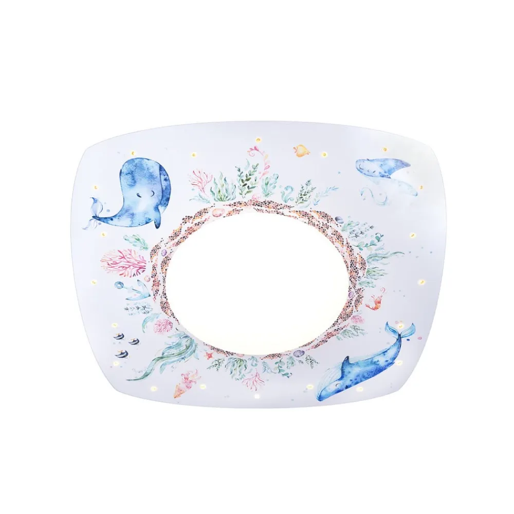 Loftlampe med havdyr i et fantasifuldt design Denne loftlampe er specielt designet til børneværelser og bringer legende elegance ind i rummet med sit farverige design. Med dette belysningselement bliver børneværelset et sted, hvor fascinationen af lys afspejles i hver eneste detalje. Denne lampe kan tændes separat, så natlampen kan tændes hver for sig. Det varmhvide hovedlys er placeret i midten. De 40 LED’er i kanten af lyset kan tændes separat som natlampe. Det er nemt at skifte mellem de to belysningsmuligheder og slå alle lyskilder sammen ved hjælp af vægkontakten – Natlysfunktion med 40 lm