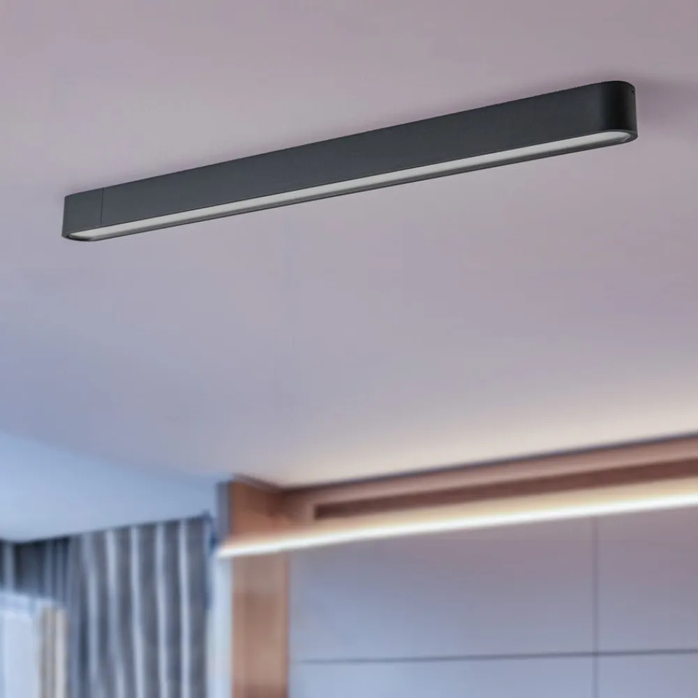 Loftlampen Soft kombinerer moderne design med funktionel belysning og er et highlight i enhver bolig. Den er fremstillet af højkvalitets aluminium og plast og imponerer med sin grafitfarvede overflade, der passer perfekt ind i forskellige indretningsstilarter. Den varmhvide lysfarve på 3.000 Kelvin skaber en behagelig atmosfære, der giver en følelse af velvære i både stuen, spisestuen og entreen.