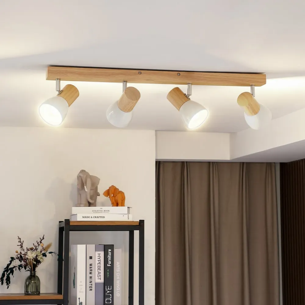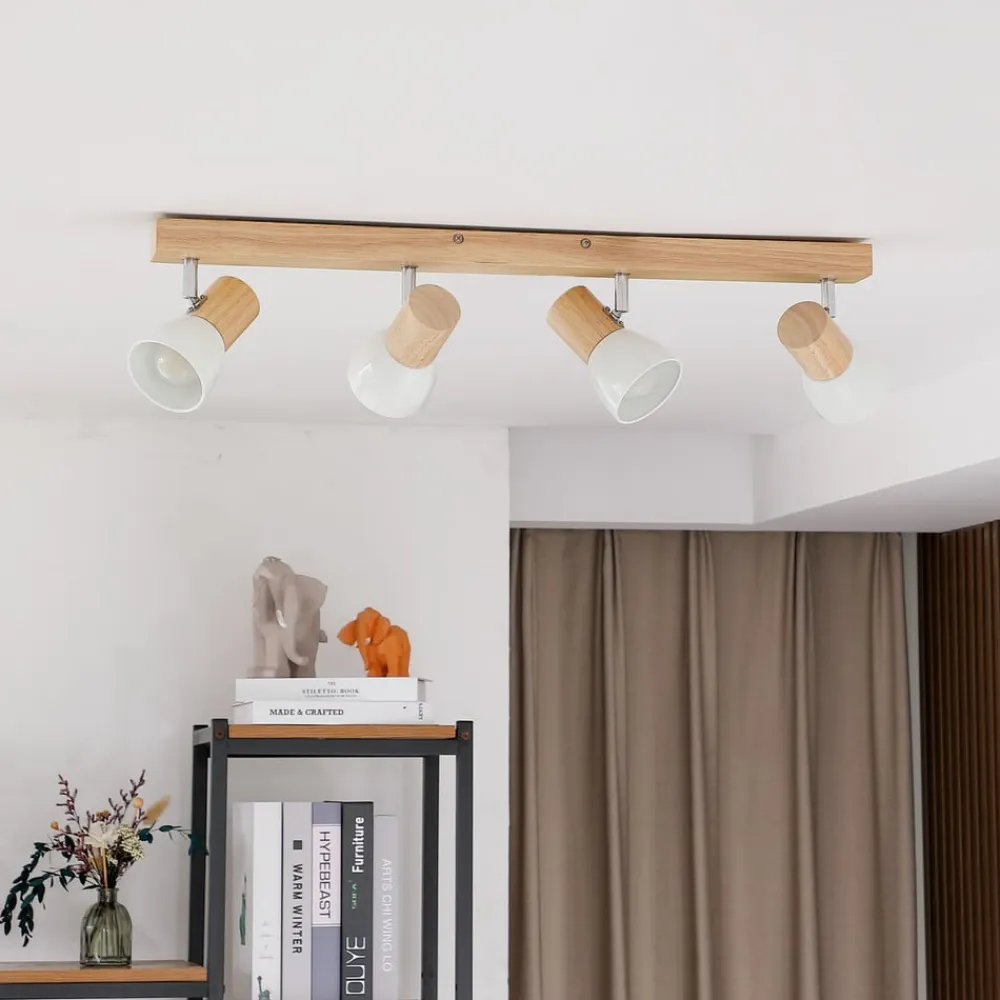 4 lyskilder Thorin loftspot med træramme Thorin ser især godt ud i køkkenet og supplerer landhusstilen, som er domineret af et naturligt præg, rigtig smukt. Hver af de pæreformede skærme er lavet af hvidlakeret metal og kan justeres efter behov, så præcis lysjustering virkelig ikke bør være et problem. Et loftspot med karisma, der bidrager til en passende belysning af boligarealet!