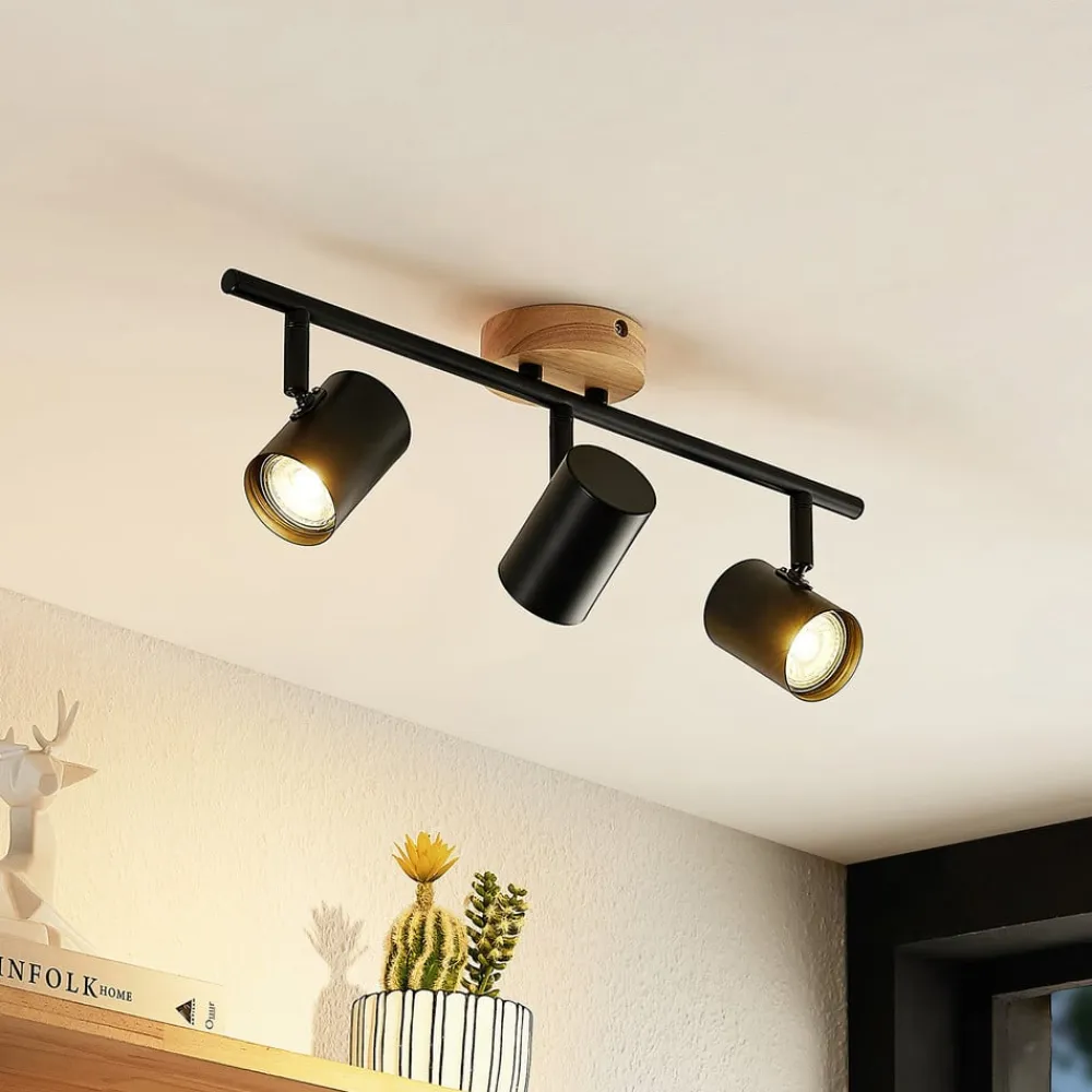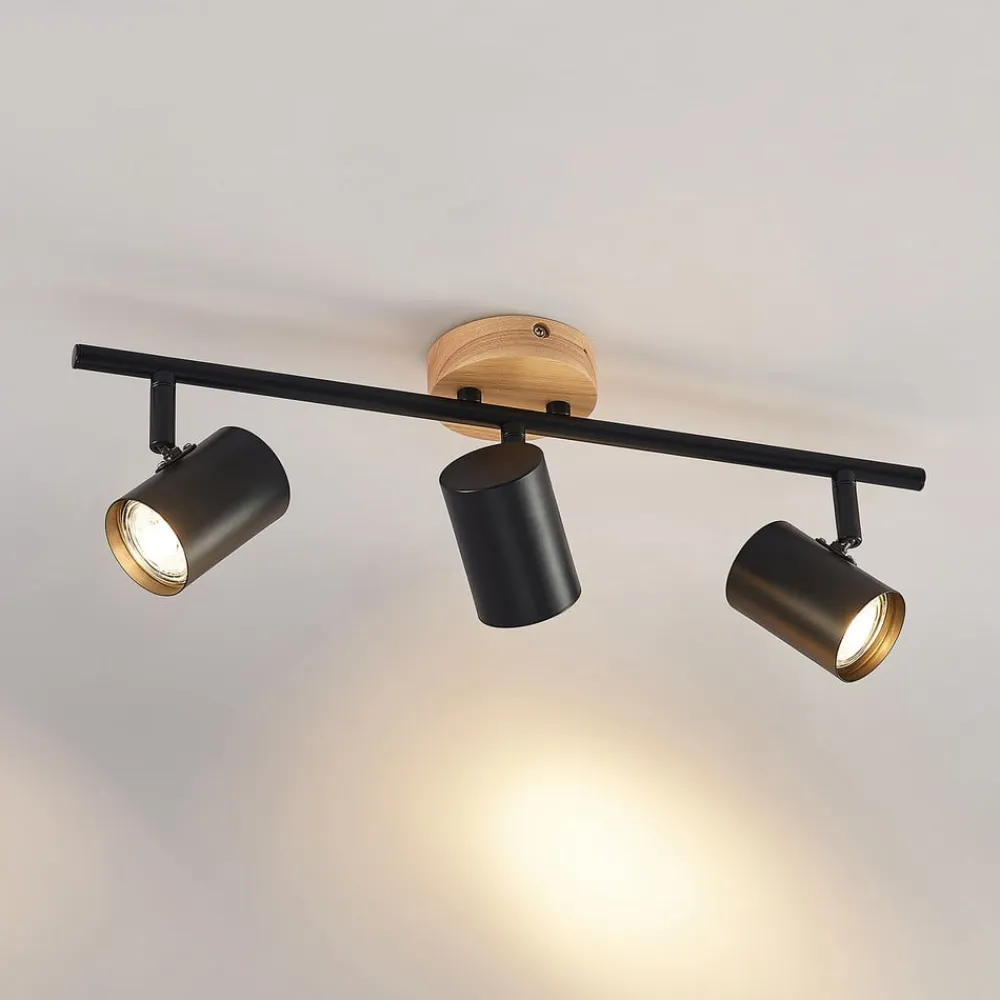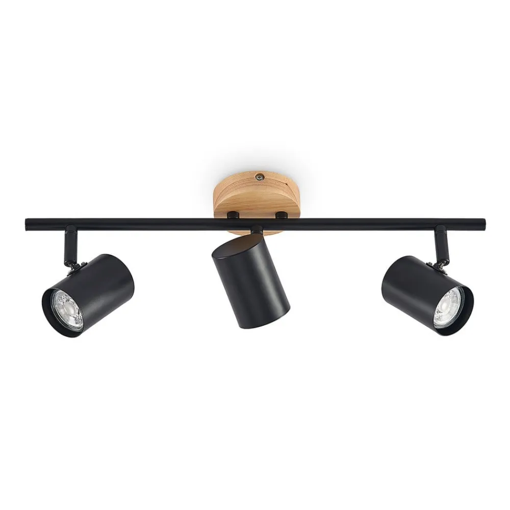 Xiomara loftlampe med 3 lyskilder og loftbeslag i træ Xiomara loftlampen er den perfekte ledsager, når det gælder om at oplyse en gang. Dens lampeskærme er lavet af sort stål og er fastgjort vandret til en langstrakt stiver, som igen hænger fra et loftbeslag af træ. De lyskilder, der skal bruges, er omgivet af de cylindriske lampeskærme og skaber blændfri belysning. Farvekombinationen af træ og sort sikrer et perfekt helhedsindtryk og gør det nemt at integrere den med resten af møblerne. Takket være sit enkle og slanke design er Xiomara loftlampen perfekt til installation i korridorer, men den kan også nemt finde en god plads i andre rum.