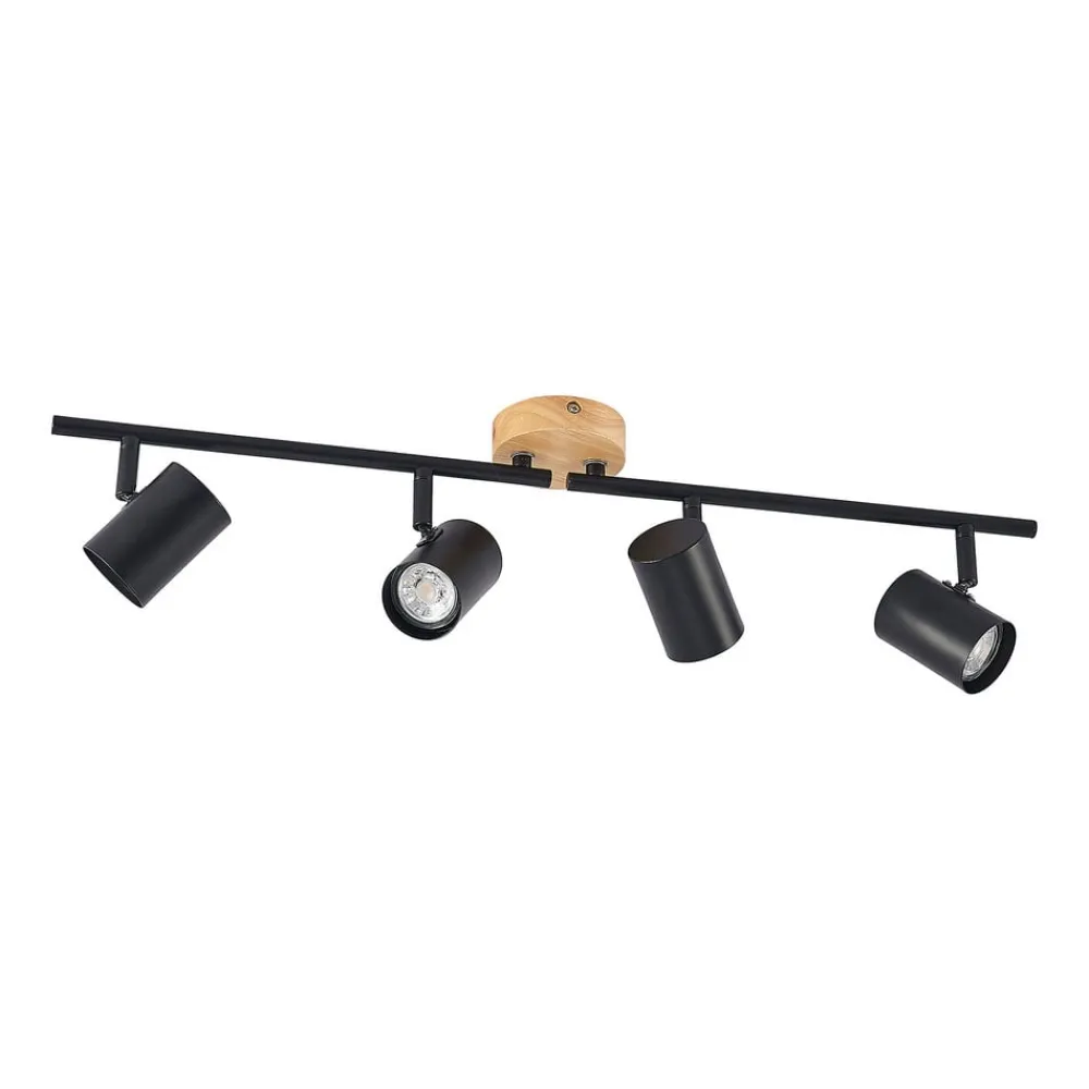 Xiomara loftlampe med 4 lyskilder i sort stål Xiomara loftlampen kombinerer en stilfuld farvekombination med blændfri belysning. Lampeskærmene er lavet af sort stål og fastgjort vandret til en stiver, som igen er fastgjort til et loftbeslag af træ. Omgivet af lampeskærmene er der indsat pærer, som giver en blændfri belysning af en korridor. Farvekombinationen af sort og træ smelter ubesværet sammen med resten af rummets indretning og afrunder det flot. Takket være sin slanke og kompakte størrelse er Xiomara loftlampen perfekt til installation i korridorer, men gør også en god figur i andre rum.