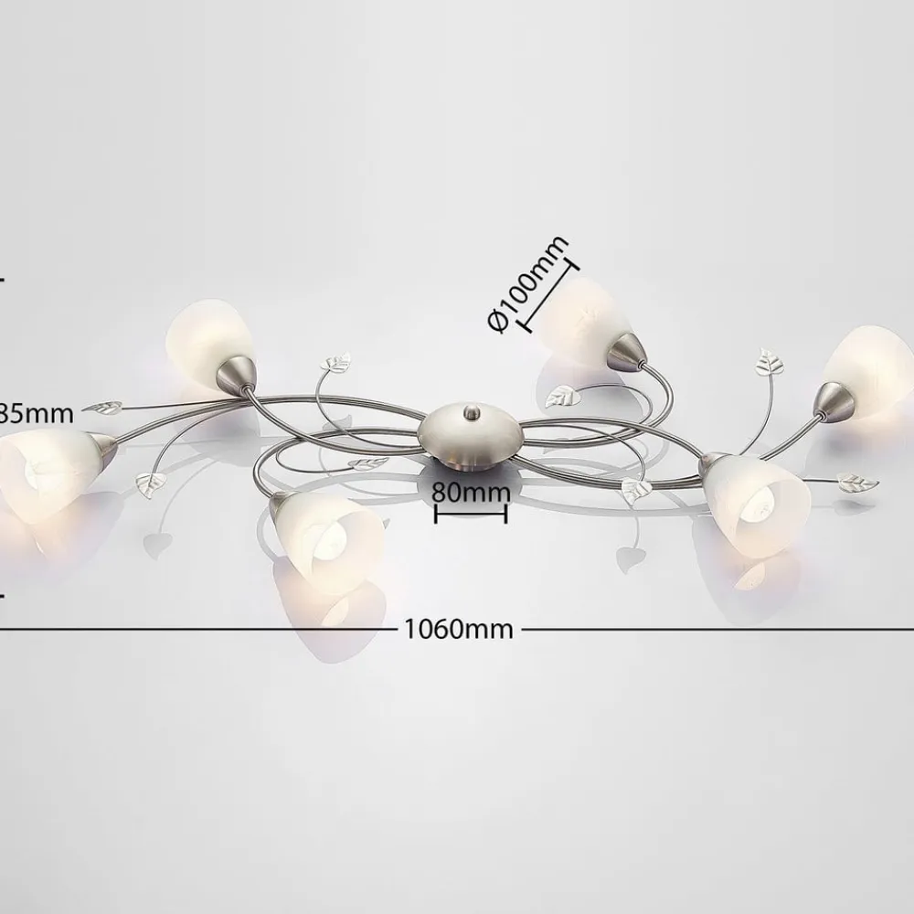 Yannie – elegant buet loftlampe, 6 lyskilder Den moderne Yannie-loftlampe er ideel til stemningsbelysning i moderne boligområder. Med sine seks fatninger, som kan udstyres med matchende pærer, sender Yannie-armaturet et behageligt, jævnt og blændfrit lys ud i rummet. Metalrammen er udført i satineret nikkel og suppleres af kontrasterende hvide, let marmorerede glasskærme. Disse sidder i den øverste ende af elegant buede lampearme, som er dekorativt dekoreret uden blade.