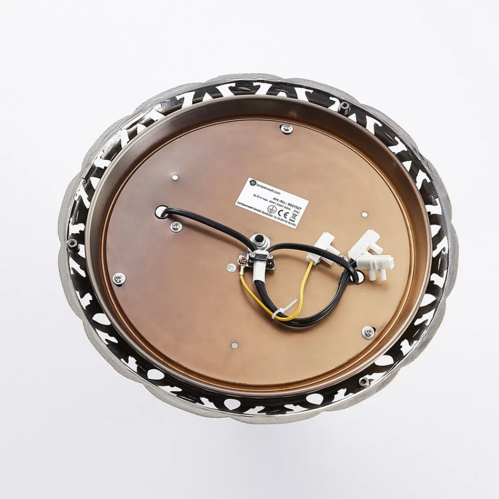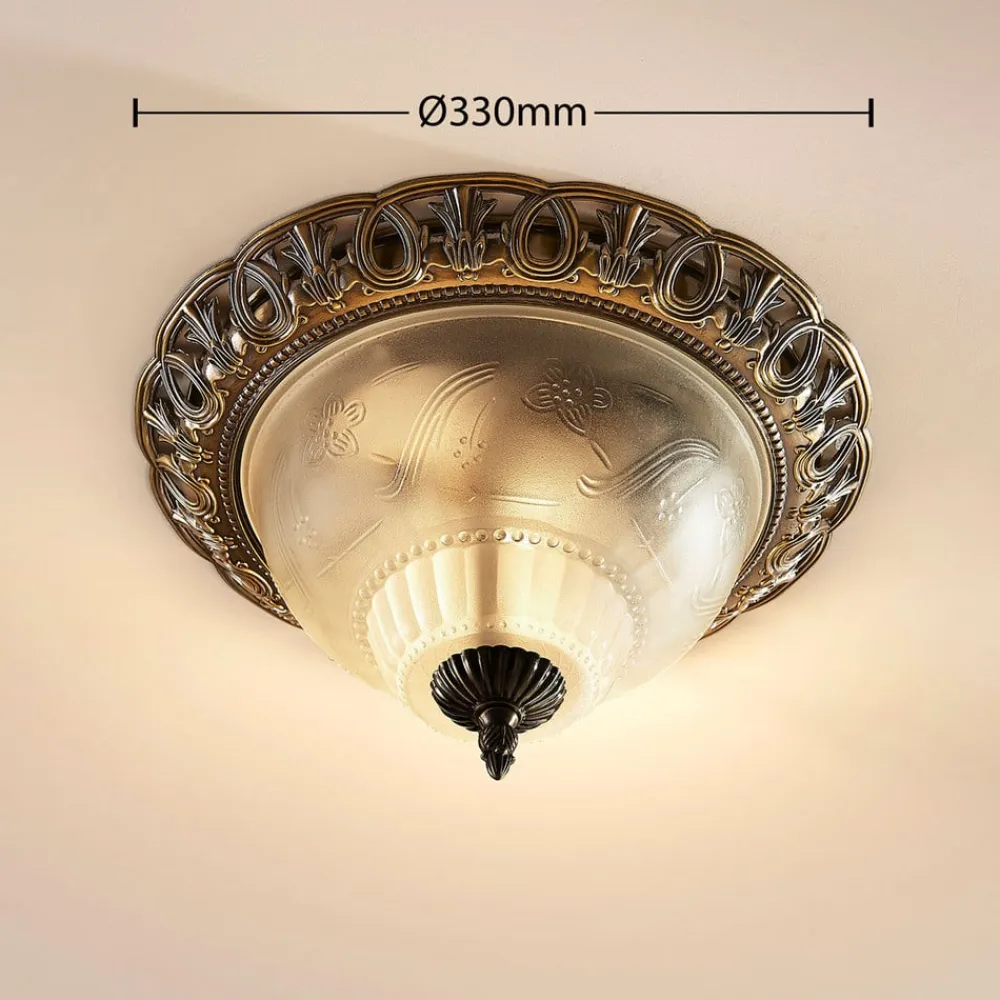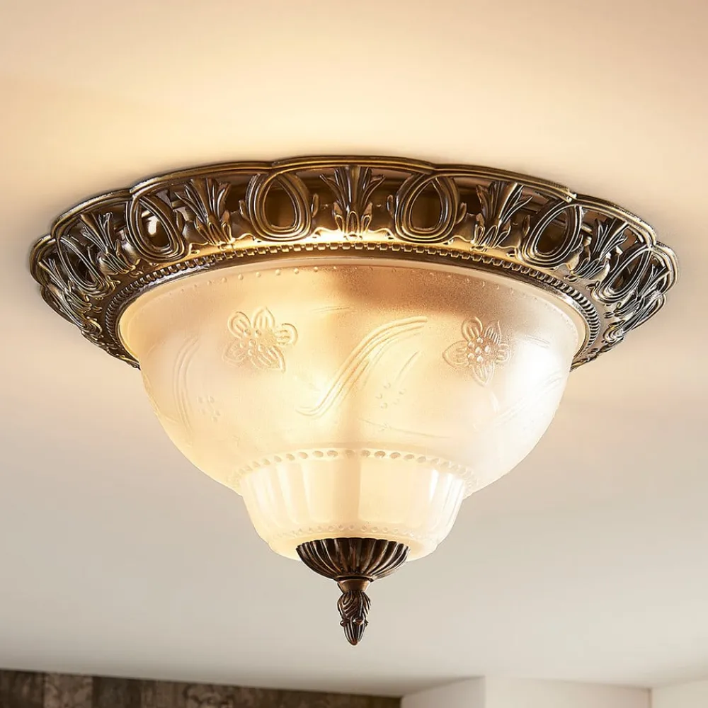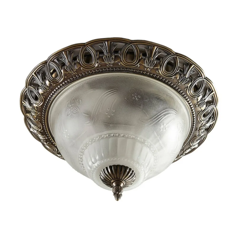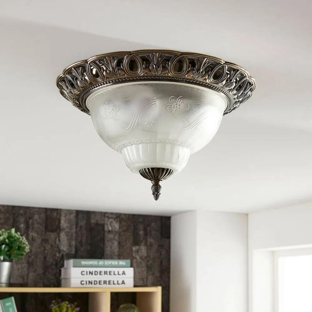 Rund loftslampe Anni med ætset glasskærm Anni er en stilfuld lyskilde med et klassisk udtryk, der har et detaljeret look og derfor virker meget dekorativ. Glasskærmen har en ætset overflade, så den fremstår mest satinagtig, kun mindre detaljer er lidt tydeligere, så skærmen fremstår særligt individuel. Spidsen på undersiden og det sirligt dekorerede loftsbeslag er lavet af metal. Den antikke messingfinish afrunder looket på smukkeste vis.