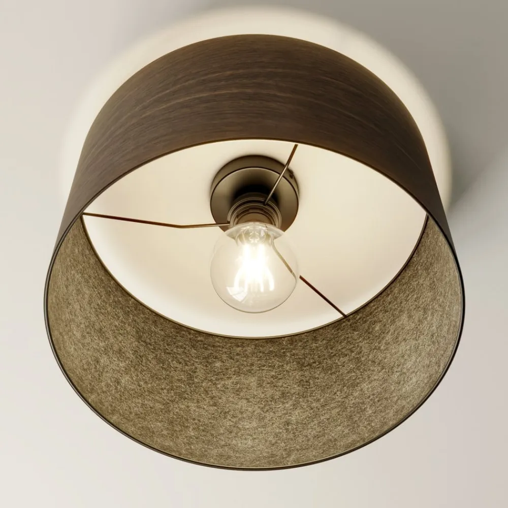 Med skærm af røget egetræsfiner – loftslampe af finér Skærmens egetræsfiner er røget for at give den en næsten sort farve. De naturlige årer er bevaret. Det giver Veneer-loftslampen et særligt elegant udseende. Takket være den vertikalt åbne cylindriske form giver den direkte belysning af området nedenunder. Envostar-armaturerne er fremstillet i Europa, hvilket reducerer transportafstandene og den dermed forbundne CO2-udledning. Desuden anvendes der ikke plast, polystyren osv. i emballagen.