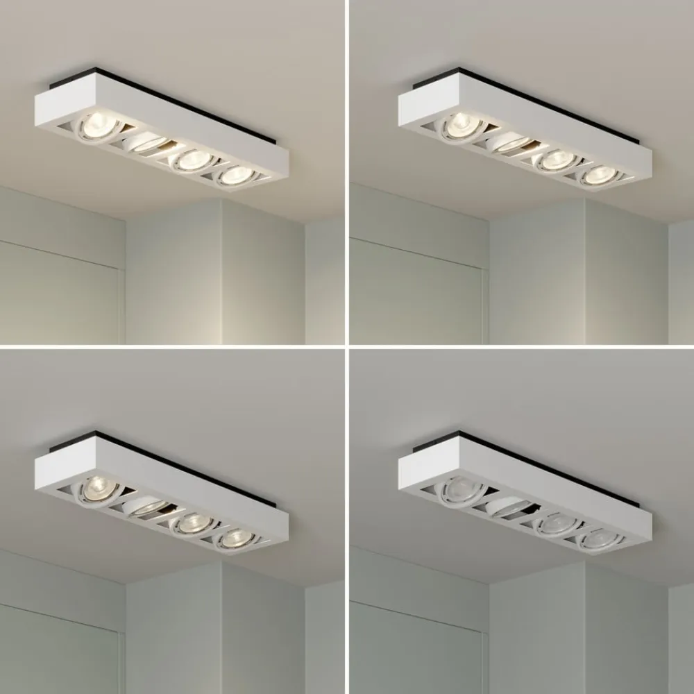 Aflang, 4 lyskilder Ronka loftlampe til GU10-lamper Ronka er velegnet til både private områder – som køkkener, korridorer og kontorer – og erhvervsejendomme, hvor loftspottet f.eks. kan bruges som butiksbelysning. Lamperne kan drejes efter behov, da indsatserne er bevægelige, og LED-loftlampen er udstyret med en skrueløs tilslutningsterminal, der muliggør hurtig installation uden brug af værktøj. Den hvide overflade har et behageligt tidløst udseende, og helhedsindtrykket er præget af et funktionelt, minimalistisk look.
