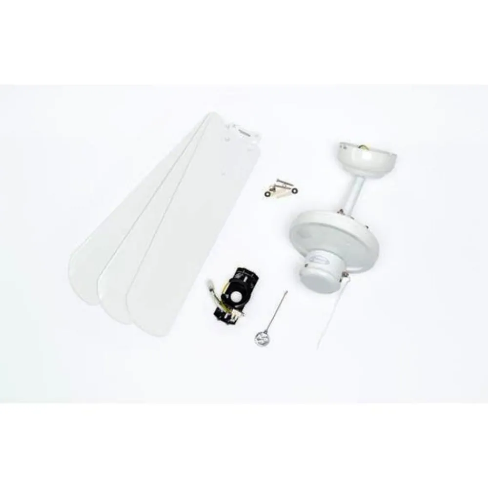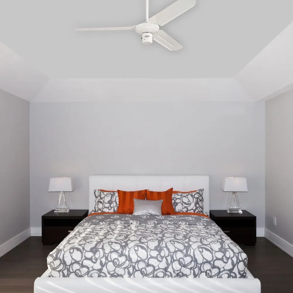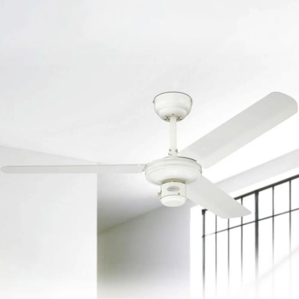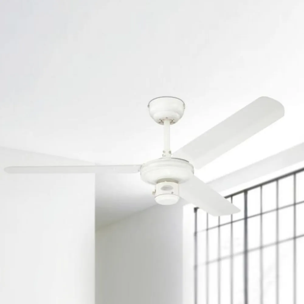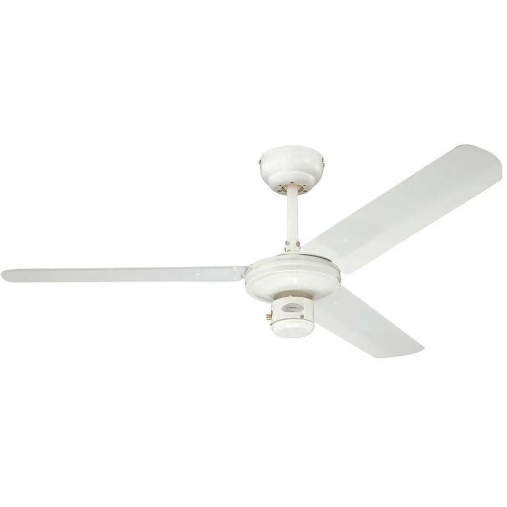 Hvid industriel loftventilator med tre blade Den industrielle loftventilator (af mærket Westinghouse) har en slank, elegant metalkrop i en gennemgående hvid farve. De tre blade er også hvide. Den kan opgraderes med en vægkontakt eller en fjernbetjening (fås som tilbehør). En forlængerstang anbefales til flade lofter med en højde på over 3,50 meter (se tilbehør). Funktioner Ventilatoren kører med tre hastigheder, der styres af en trækafbryder. Den fremadgående eller bagudgående hastighed kan indstilles ved hjælp af en skyder. Den fremadgående sommerfunktion er beregnet til køleeffekt, og den bagudgående vinterfunktion til cirkulation af varm luft. Sidstnævnte sparer varmeenergiomkostninger på op til ca. 30 %. Tekniske data Effekt pr. hastighed: – 25 watt ved 115 o/min – 35 watt ved 165 o/min – 52 watt ved 240 o/min Særlige egenskaber Udstyret med en meget støjsvag motor og anbefales derfor også til brug i soveværelser.