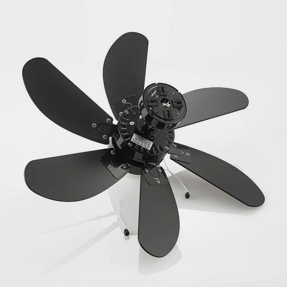 Praktisk Minja loftventilator af sort stål med seks bøgetræsblade Minja har et harmonisk design i en slående farvekontrast. Loftbeslaget bærer en krop, der er udstyret med seks bøgetræsblade og en glasdiffusor, der kan monteres med passende lyskilder. Kombinationen af sort og lyst træ afrunder ventilatorens design flot. Funktioner Ventilatoren har to trækkontakter, der kan bruges til at styre dens rotation og lyset. Den har også en kontakt på huset, der kan bruges til at skifte fra frem til tilbage. Tekniske data Motorhastighed: 190/145/80 o/min Motoreffekt: 24/12/6 watt Luftcirkulation: 40,08/15,24/4,2 m³/min Ventilatorens lydeffektniveau: 42,4/39,8/39,6 dB