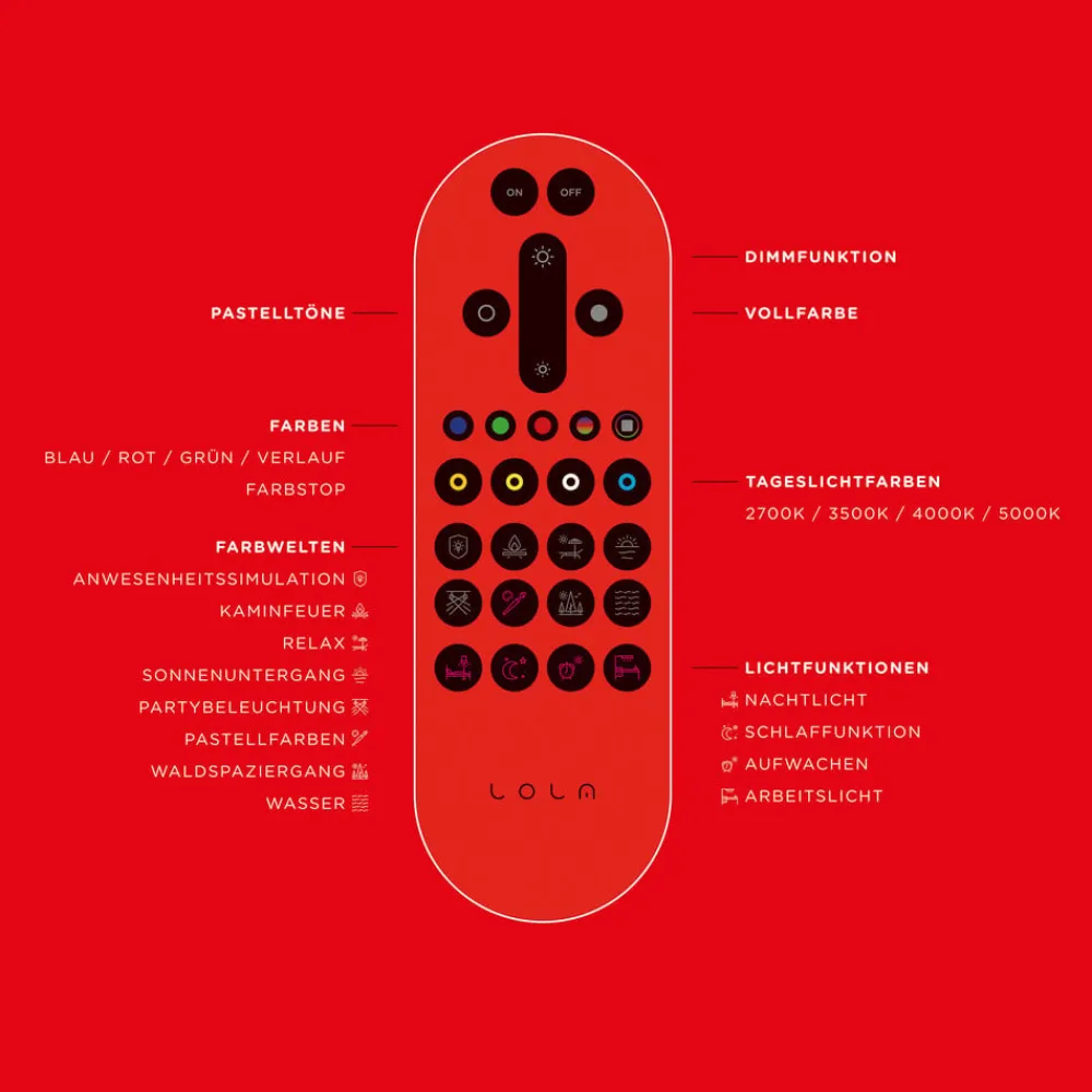 LOLA Smart Disc LED-loftlampe imponerer med sine mange forskellige funktioner, der gør det muligt at skabe de optimale lysforhold til enhver tid. Takket være det diskrete og tidløse design er loftslampen nem at integrere i forskellige boligområder og møbler. Den kan f.eks. bruges som lyskilde i stuen eller soveværelset. Armaturet kan dæmpes via den medfølgende fjernbetjening, og farvetemperaturen kan også justeres fra varm til universalhvid, og RGBW-farveskiftet kan styres. Der findes også forudkonfigurerede lysscenarier. Særligt praktisk: LOLA Smart kan også styres via smartphone eller tablet med MEDION Life+ app’en.