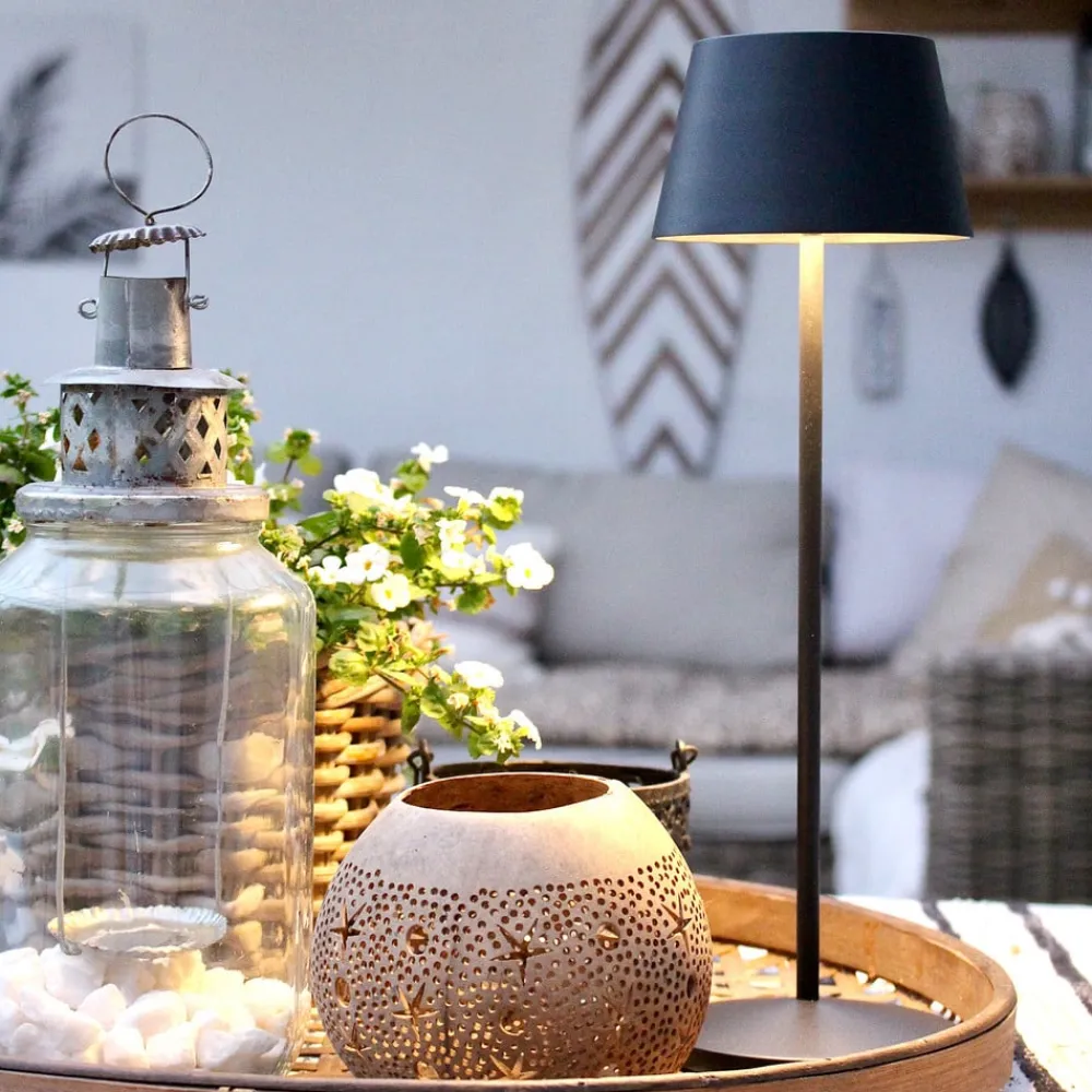 Modi batteridrevet LED-bordlampe til accent og ekstra belysning indendørs og udendørs Uanset om det er på et sidebord i stuen, på terrassen eller til en havefest om aftenen – Modi bordlampen er et dekorativt, mobilt tilbehør til mange forskellige omgivelser og lejligheder. Den har et tidløst design med en rund base, en slank arm og en skærm med kegleform. Sidstnævnte er udstyret med LED’er, der udsender varmhvidt lys nedad. Den betjenes med en berøringskontakt, som også gør det muligt at dæmpe fra 100 % til 5 % og ændre farvetemperaturen (2.700 K / 3.000 K). Batteriet muliggør drift uden eksterne strømkilder – Kapslingsgrad: IP65 – Slagfasthed: IK06 – Inkluderer induktionsladestation med USB-kabel (til én lampe) til opladning i tørre omgivelser – Batteri: 18650 Li-Ion, 2 x 2.200 mAh – Opladningstid: 6 timer – Driftstid pr. opladning: 9 timer ved 100 % lysudbytte – Beskyttes mod direkte sollys