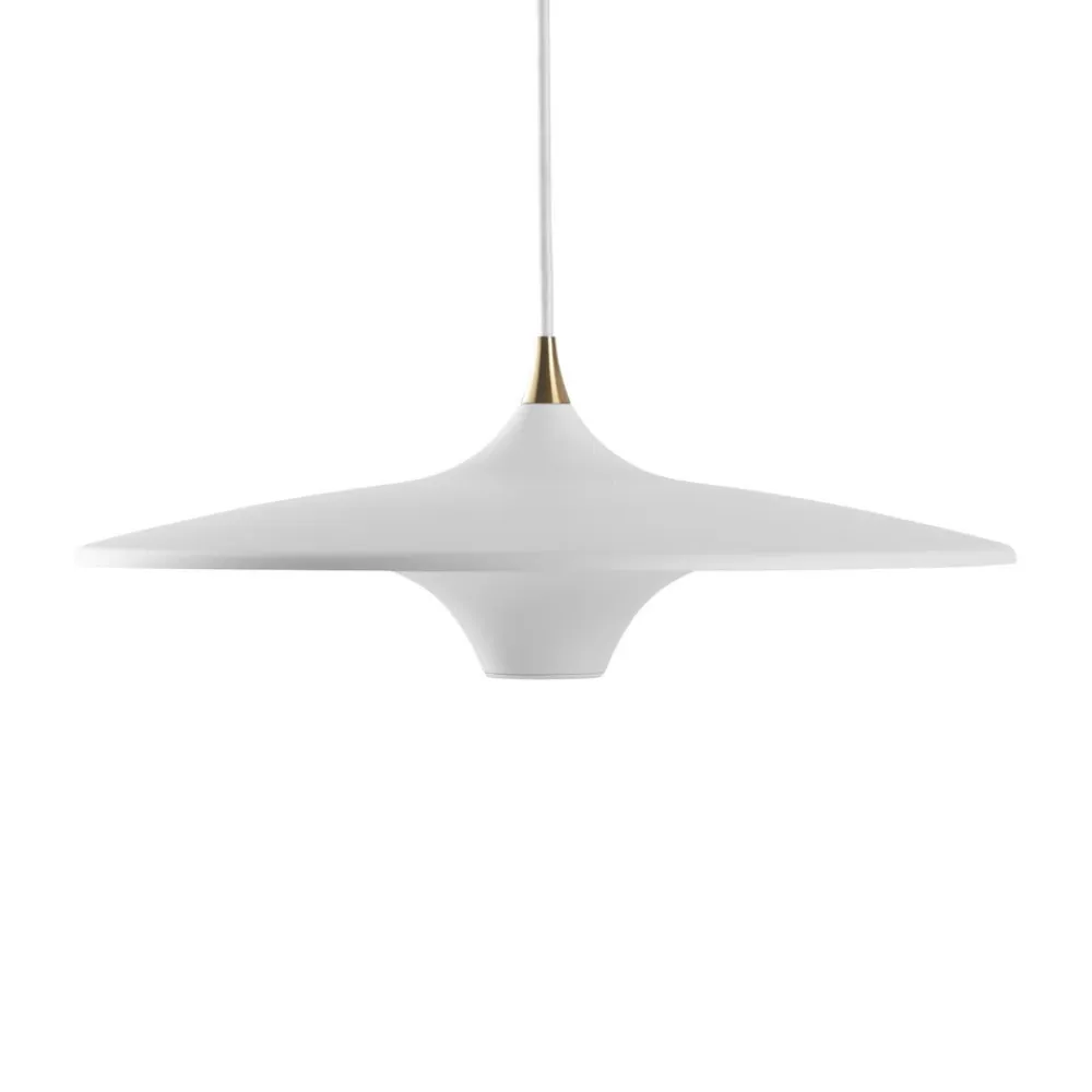 Moja LED-pendel med opadgående og nedadgående lys Moja er en smuk og slank pendel skabt til et moderne interiør. Pendlen har en smuk aluminiumsskærm, der suppleres med en messingplade og stofledning – resultatet er et stilfuldt og elegant udtryk. Med sit lette og næsten svævende udseende er Moja en pendel, der er ideel til moderne rum og miljøer. På trods af det diskrete og minimalistiske design giver den et smukt lys. Pendlen har integreret LED-belysning med direkte og indirekte lysfordeling, som skaber både funktionelt lys opad og nedad og en behagelig atmosfære.