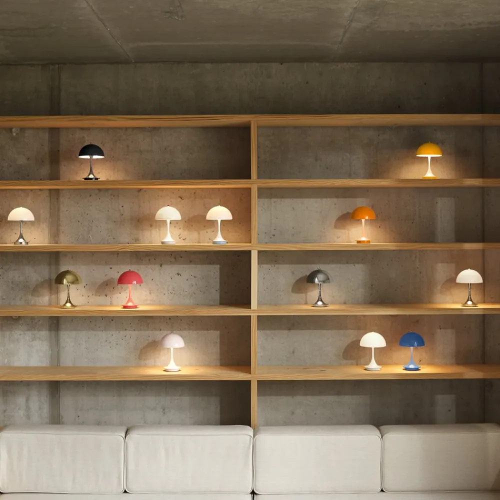 Den batteridrevne LED-bordlampe Panthella Portable 160 i 3. version er fremstillet af sprøjtestøbt, genanvendt polymer. Den er udstyret med en touch-kontakt på den øverste møtrik, hvorved den kan tændes og slukkes og indstilles i tre lysstyrkeniveauer. Designet af Panthella-lampen er et af Verner Pantons mest betydningsfulde designs og afspejler den danske arkitekts store personlighed. Han ønskede at designe en organisk formet lampe, der leverer 100 % blændfrit lys, hvor stativet og skærmen fungerer som lysreflektorer. Panton udviklede Panthella-lampen i 1971 i samarbejde med Louis Poulsen. Lampens karakteristiske form og dens evne til at reflektere et blødt lys fra sin trompetformede fod har givet den status som en designikon. Panthella 160 Portable-lampen er en mindre version af det oprindelige design. Den er perfekt til at tage med fra rum til rum eller ud på altanen eller i haven. Den ser fantastisk ud overalt og skaber en vidunderlig atmosfære.