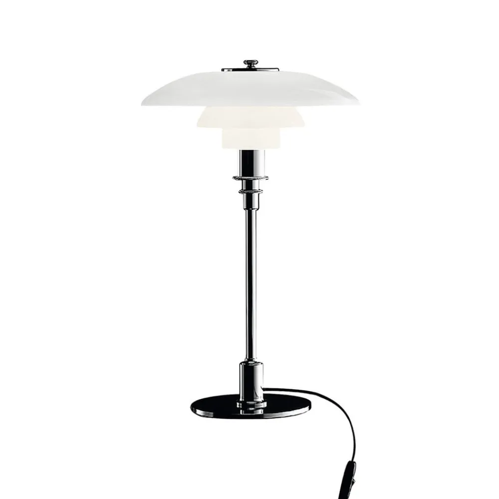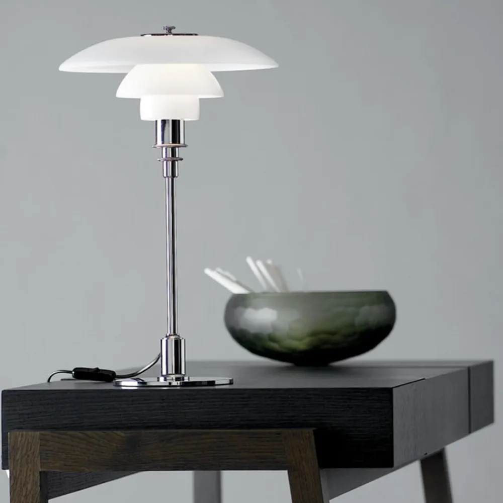 Tidløs smuk designerbordlampe PH 3/2 PH 3/2-bordlampen tiltrækker sig opmærksomhed ved første øjekast, selv når den ikke er tændt, takket være dens harmoniske design, som gør det muligt at integrere den i mange indretningsstile. En af grundene til dette er den iøjnefaldende skærm af trelags opalglas. Glasset har en mat sandblæst finish på indersiden, hvilket giver et behageligt blødt lysmønster, og skinner på ydersiden. Det meste af lyset sendes dog nedad og oplyser omgivelserne, f.eks. placeret på et sidebord i stuen, med stemningsfuld accentbelysning. Den smukke opalglasskærm troner på en messingramme med en eksklusiv metalfinish, der fuldender det tidløst elegante design af PH 3/2-bordlampen.