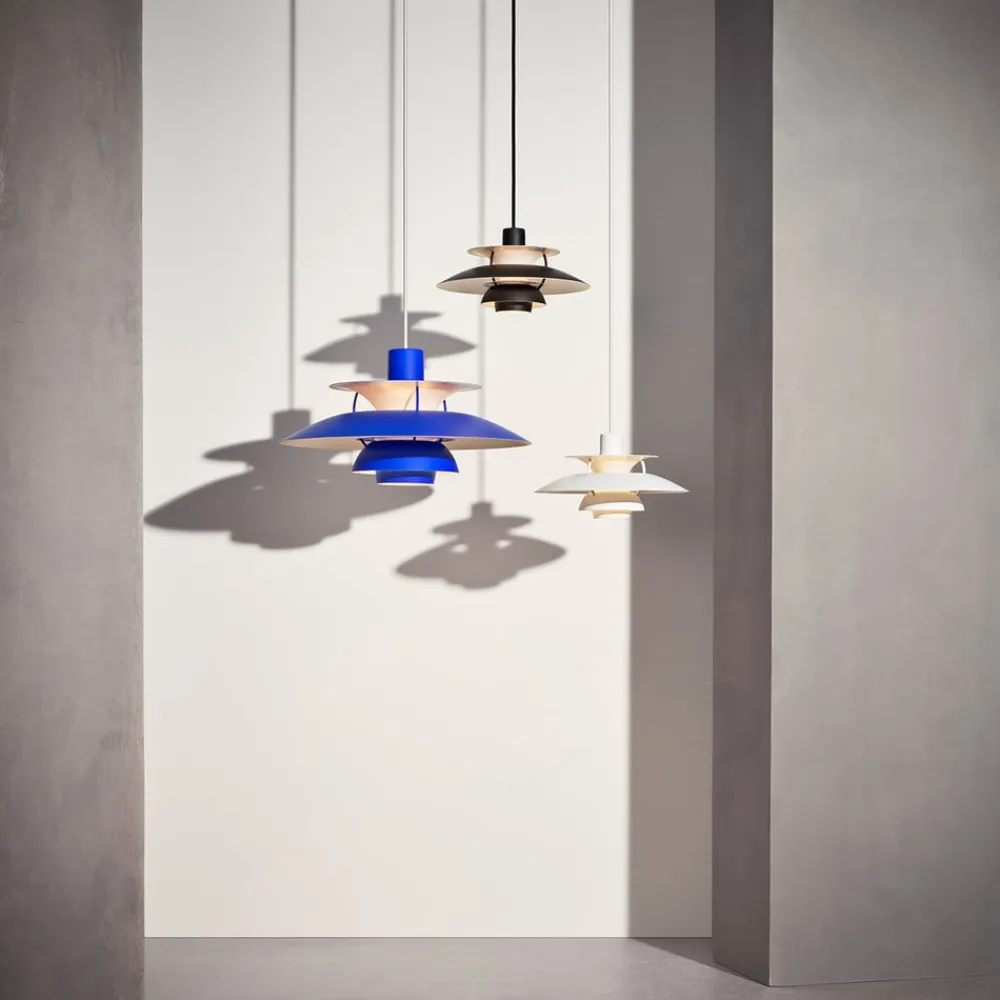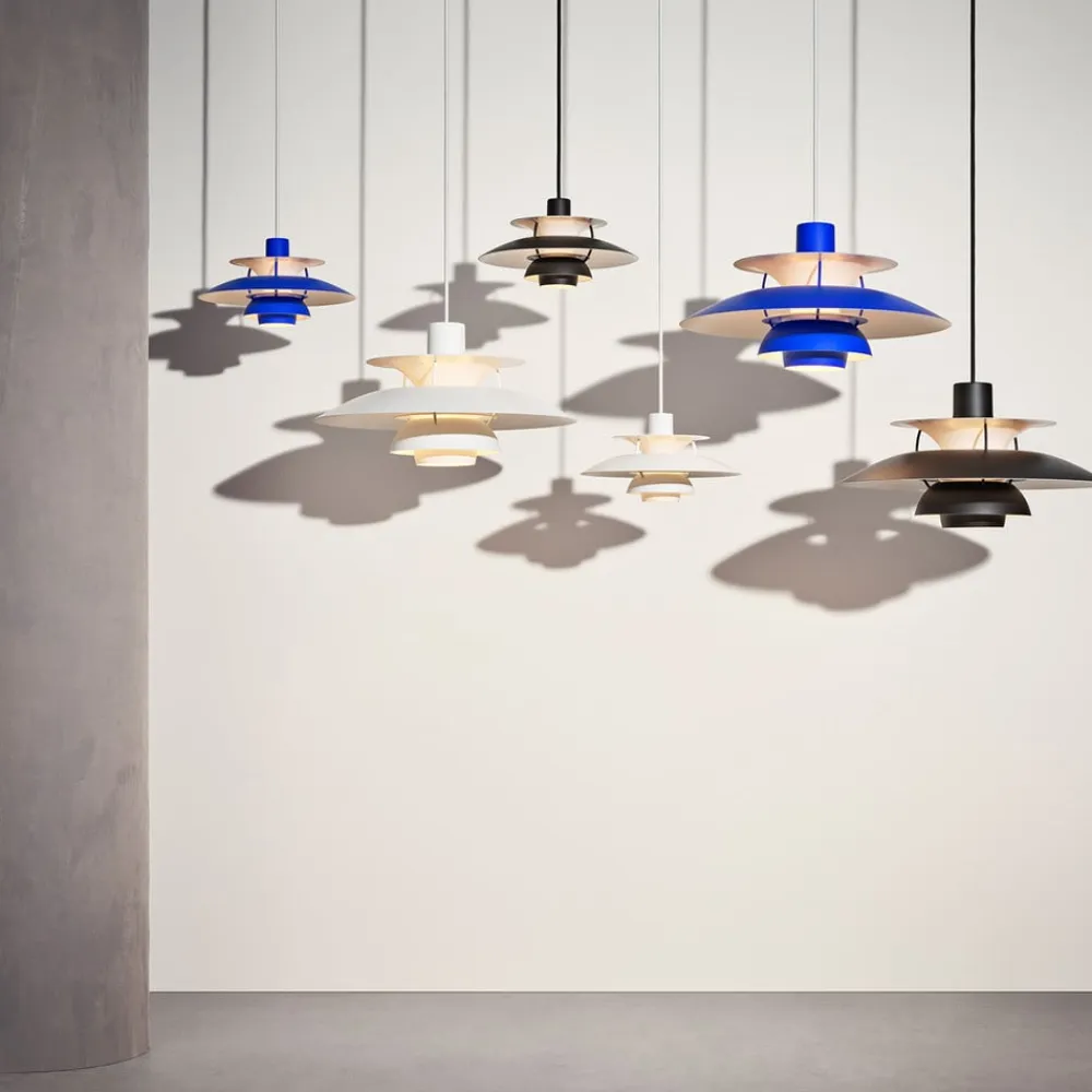 Designerpendel PH 5 i moderne monokromt look giver diffust lys Den berømte PH 5-pendels klassiske design suppleres af de monokrome farver og matlakerede skærme med et moderne look. Takket være det interessante system med tre skærme reflekterer lyset sig selv igen og igen. Størstedelen af det genererede lys sendes nedad, hvilket skaber en helt blændfri effekt og bader rummet i en hyggelig atmosfære. Lysstrålerne, der sendes ud til siden, sørger for, at hele rummet bliver diskret oplyst, og at selve armaturet også begynder at skinne. De fine forbindelsesstænger af valset aluminium giver armaturet et særligt præg og understreger PH 5’s mange forskellige former, der supplerer hinanden perfekt og afrundes med den ensartede farve. Denne pendel er et ægte belysningstilbehør, især i opholds- og spisestuer, hvor den giver god omgivelsesbelysning ud over sit attraktive udseende. PH 5-pendlen blev skabt i 1958 af den danske designer Poul Henningsen. Det var hans svar på de konstant skiftende former og størrelser af lyspærer. Den skylder sit navn til størrelsen på hovedskærmen, som har en diameter på 50 cm. Designeren levede fra 1894 til 1967 og skabte mange designerlamper for det traditionsrige danske firma Louis Poulsen, som har produceret designerlamper i over 100 år.