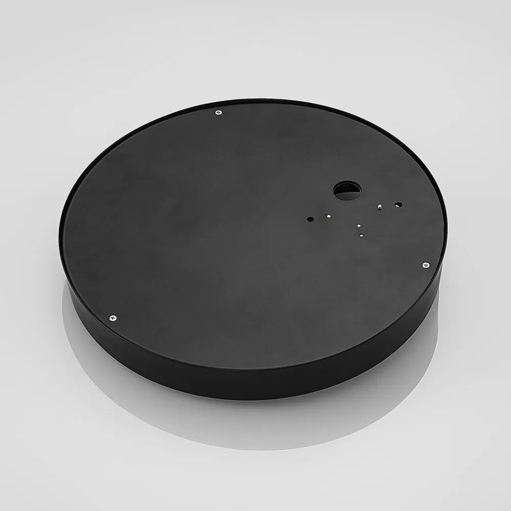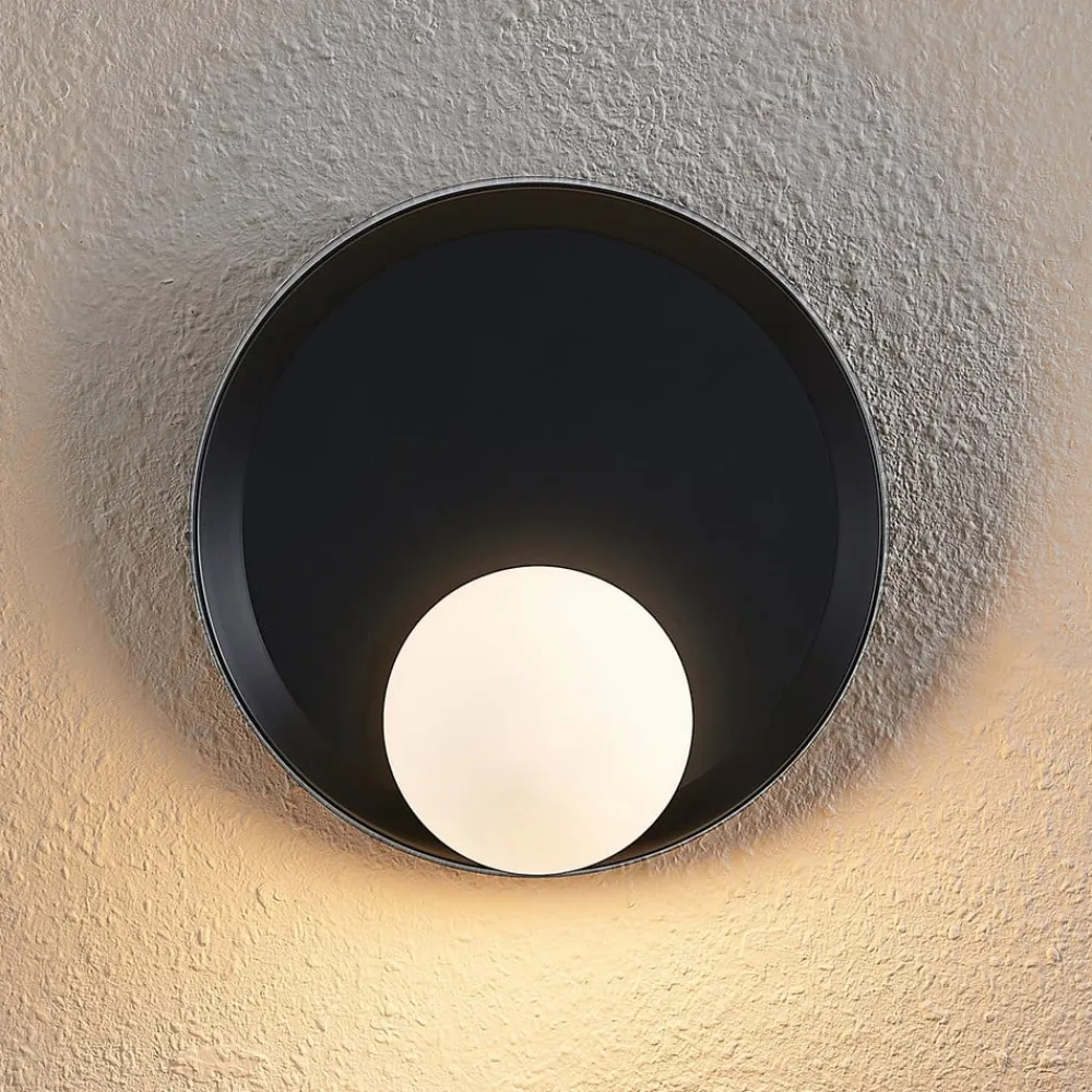 Rund design væglampe Andelina med en sort overflade og en hvid glaskugle som tilføjelse til den nederste del