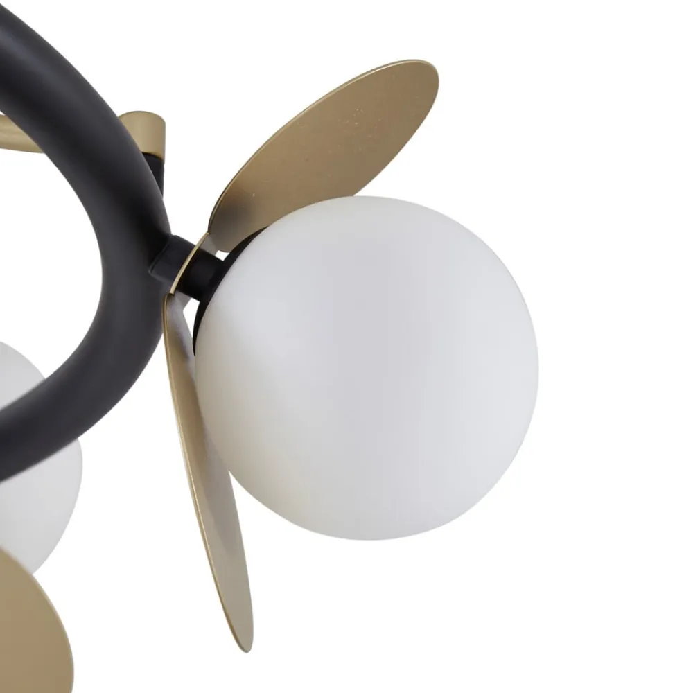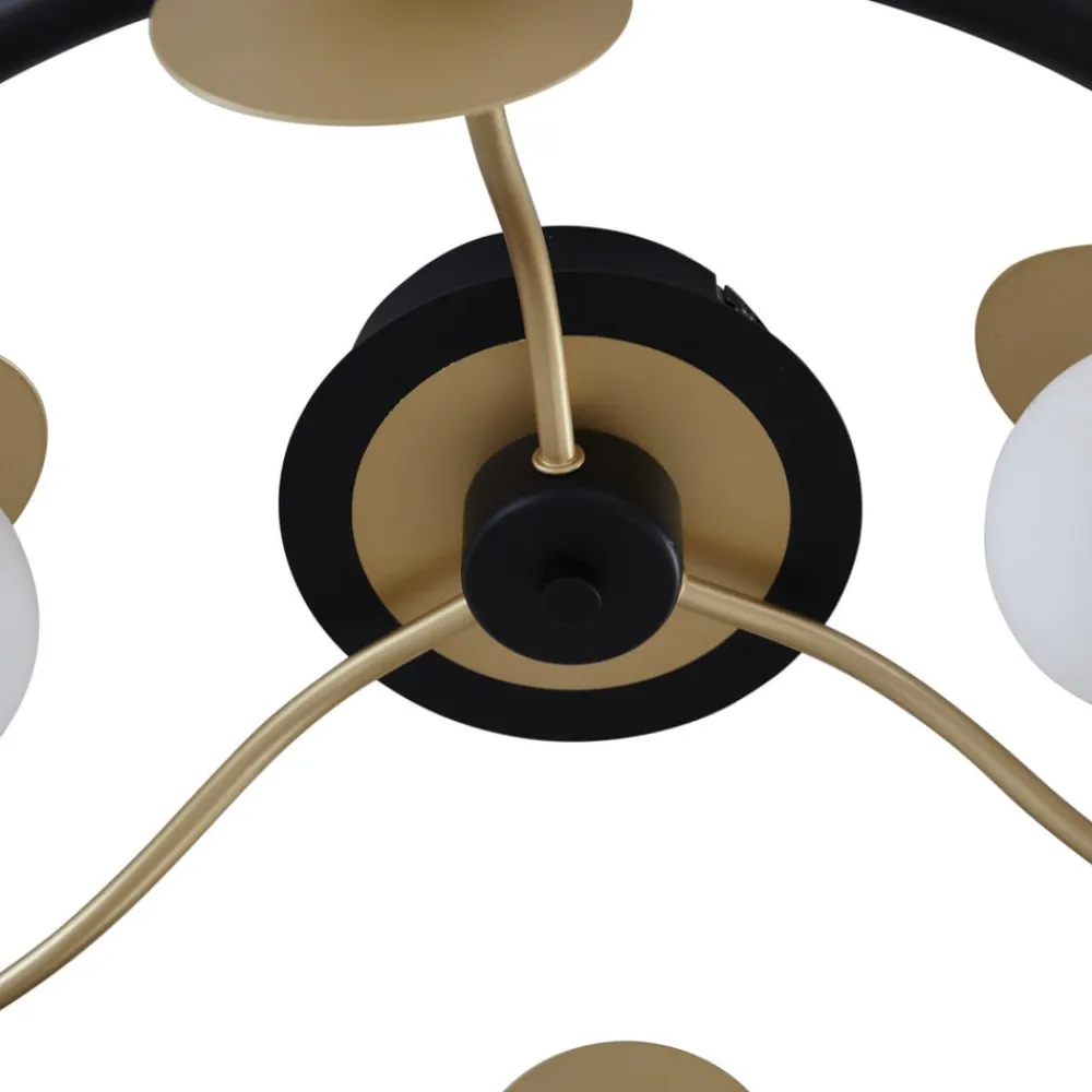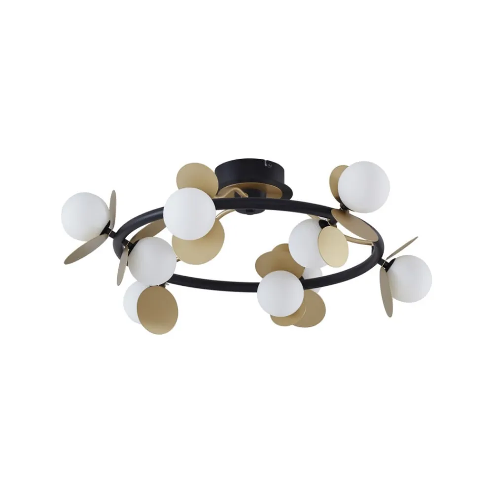 Dæmpbar Pallo LED-loftslampe med ni glaskugler Pallo LED-loftslampen er det perfekte valg til den moderne bolig. Det sorte og gyldne farveskema giver armaturet et sofistikeret præg og gør det til et ægte blikfang. De 9 lyskilder er placeret i hvide glaskugler på en cirkulær, sort ramme og er hver især udstyret med et gyldent dæksel. De varmhvide LED’er kan dæmpes i tre trin ved hjælp af en almindelig vægkontakt.