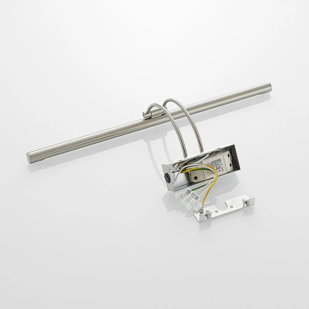 Elegant Dimitrij LED-gallerilampe i nikkel med mat finish Det lange hoved på Dimitrij-gallerilampen giver accentbelysning til dit yndlingsbillede i gangen eller stuen. Lampehovedet og den buede arm kan også justeres individuelt ved hjælp af to led. De permanent installerede LED’er udsender et varmhvidt, meget klart lys og er energibesparende, så belysningen kan være tændt i længere tid. Den buede arm og de slanke former giver Dimitrij en underspillet elegance, som får et moderne præg af den matte, nikkelfarvede overflade.