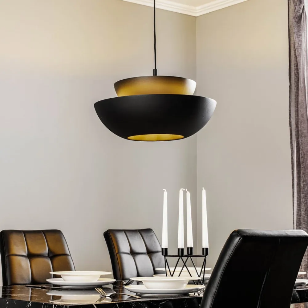 Slående hængelampe Kellina med en stilfuld dobbeltskærm Kellina er en elegant hængelampe, der imponerer med sin stålskærm. Designet ser elegant og moderne ud og passer til forskellige indretningsstile og rum. Lampen kan skabe en hyggelig atmosfære over dit eget spisebord eller over en bardisk på et hotel – Kellina kan bruges på mange forskellige måder. Mens ophænget er holdt helt enkelt, skiller armaturet sig først og fremmest ud med sin velformede dobbeltskærm. Skærmen giver en blændfri lysfordeling i rummet og er et ægte blikfang i loftet.