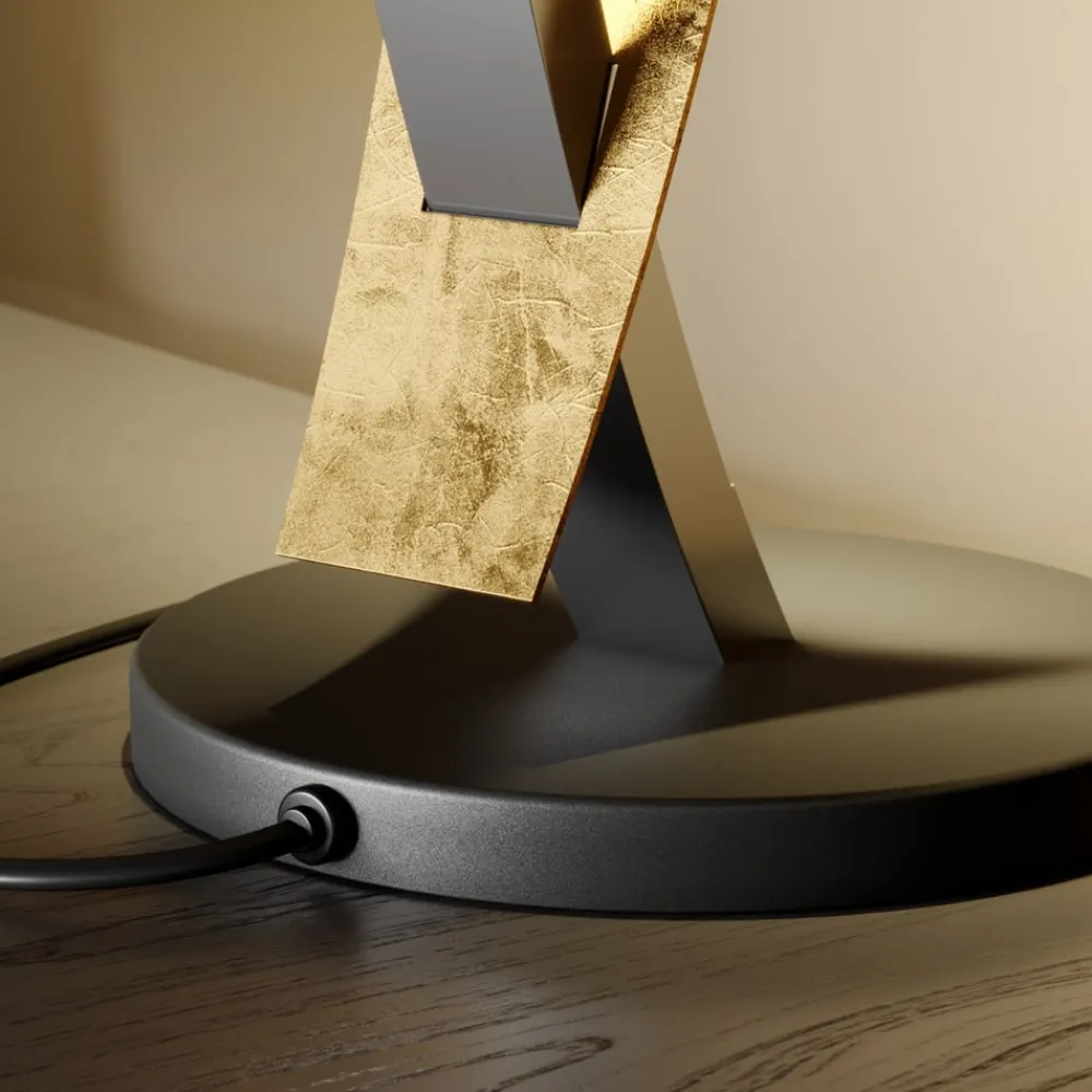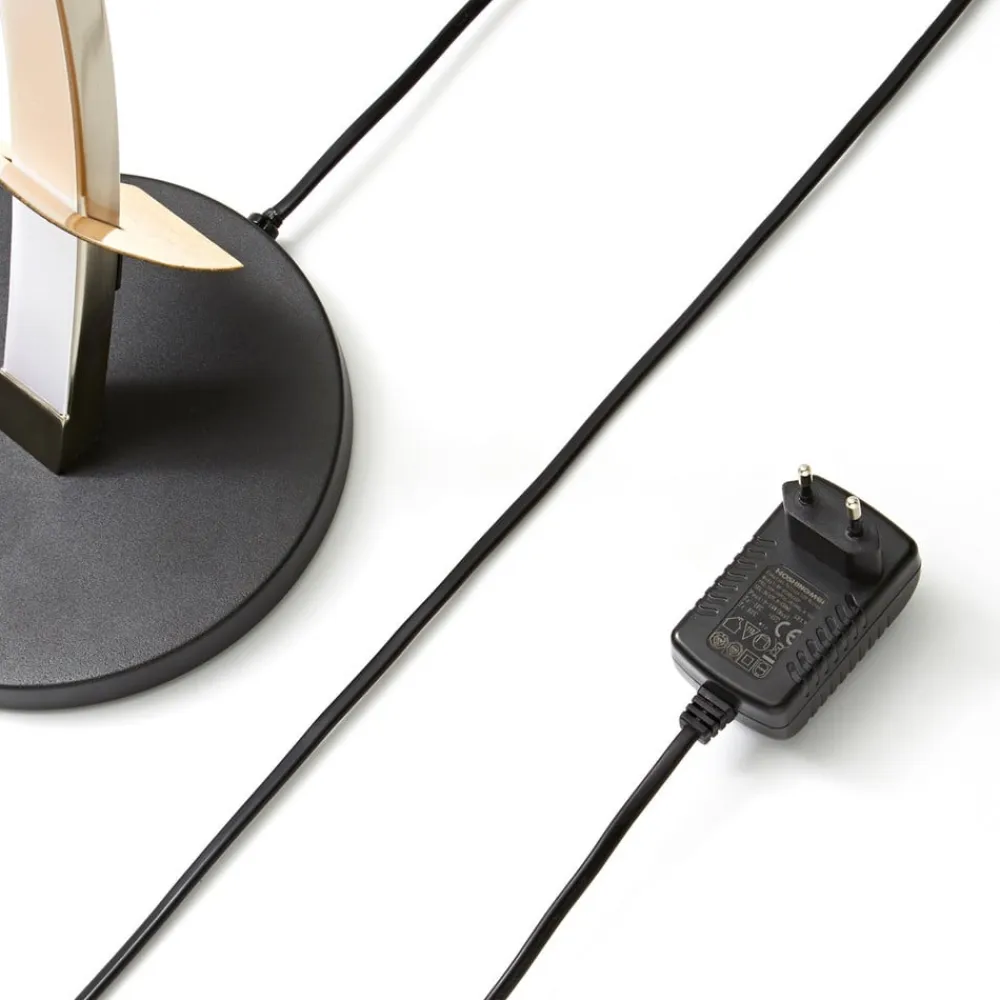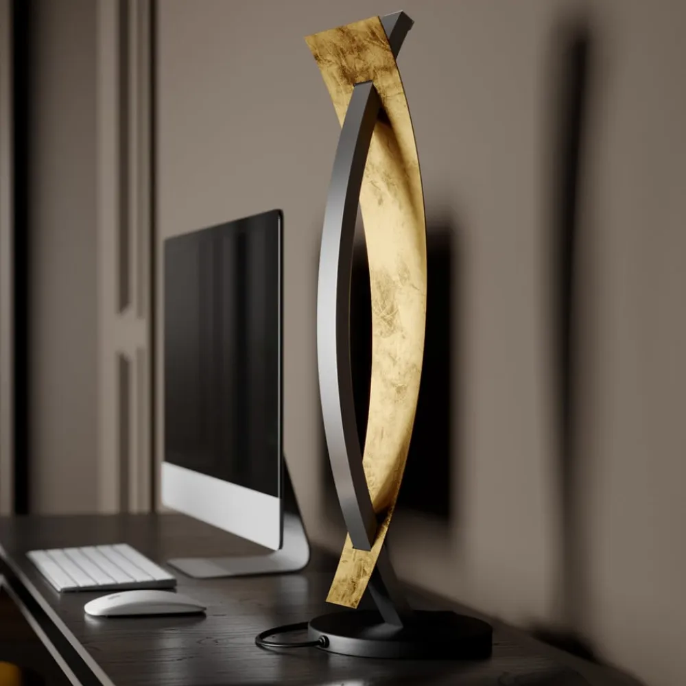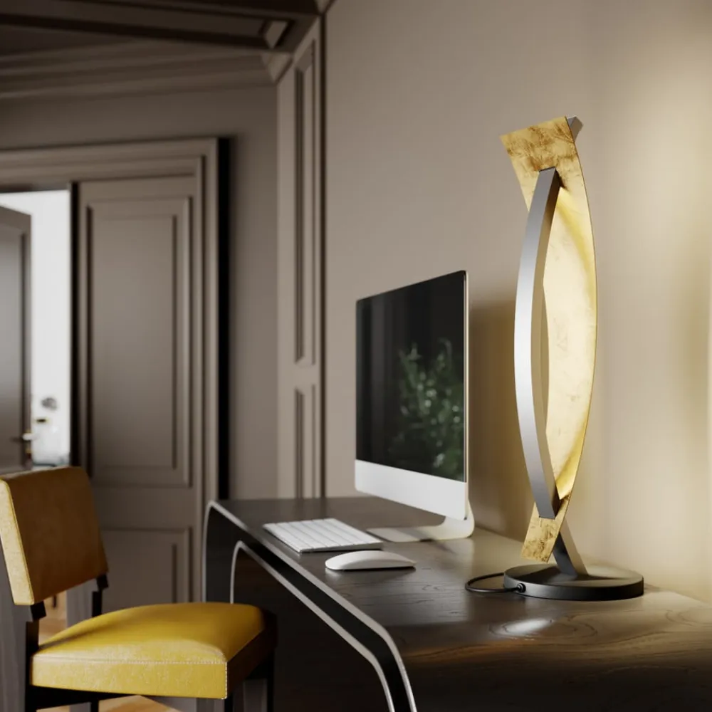 En guldfarvet og sort lyskilde: LED-bordlampen Marija, dæmpbar Så snart LED-pæren i Marija-bordlampen er tændt, bades bordet eller skænken i varmhvidt lys. Men Marija LED-bordlampen er meget mere end bare en pragmatisk bordlampe. Den imponerer med sin organiske form, som dygtigt bidrager til udsmykningen af et elegant møbleret rum. Et let buet lysrør rejser sig fra den runde base og støtter en smal metalskærm i sort. Denne er buet i den modsatte retning. Bordlampen kan dæmmes i tre trin for større komfort i stuen eller soveværelset.