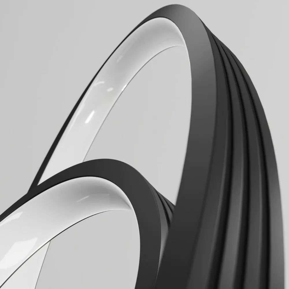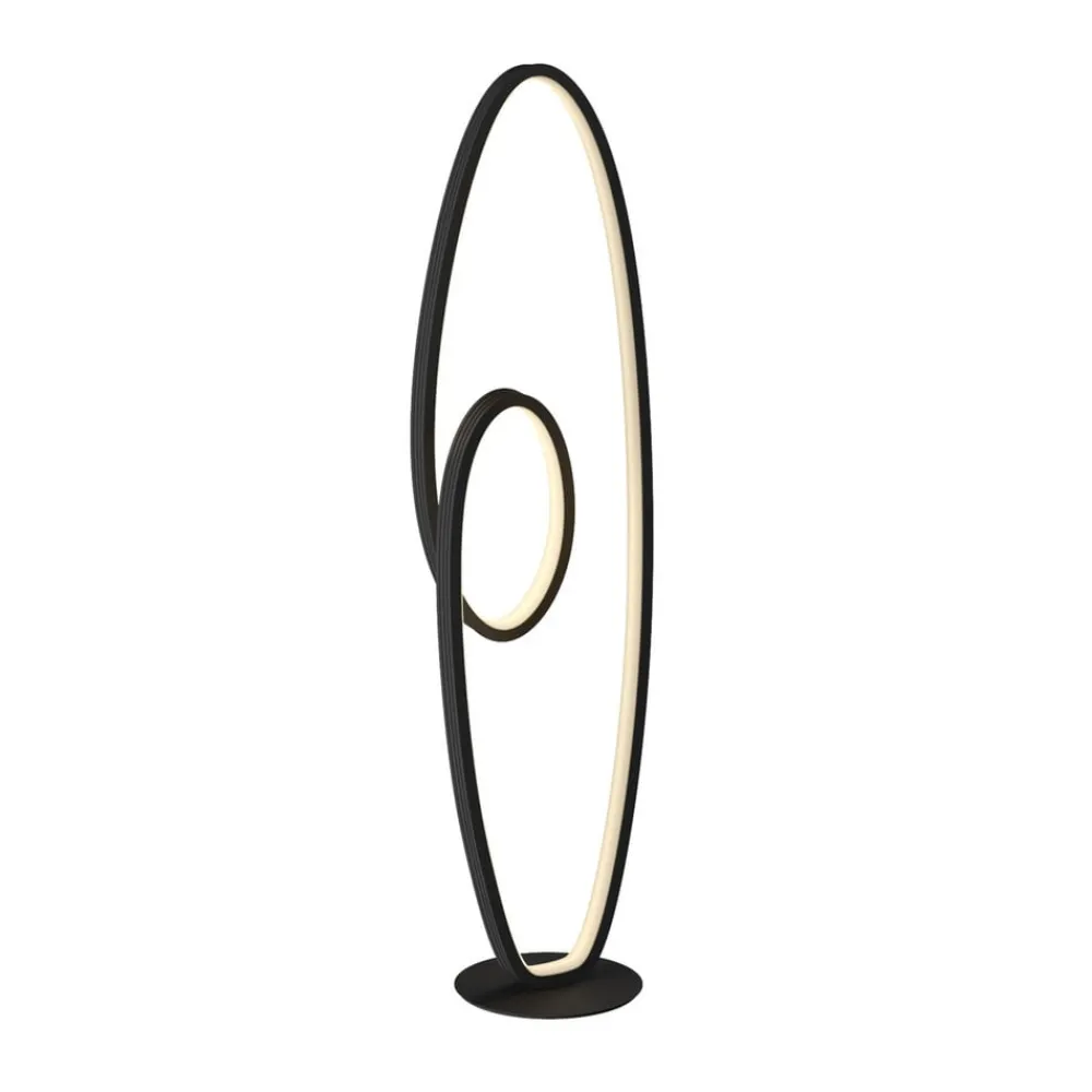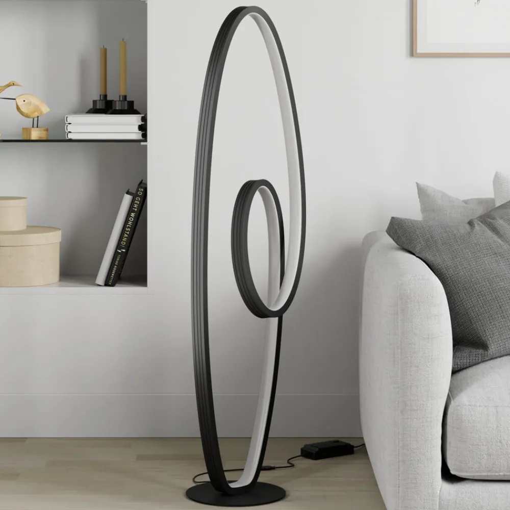 Dæmpbar, buet Bronwyn LED-gulvlampe Bronwyn LED-gulvlampen med sin sidesløjfe ligner noget, der er taget direkte ud af en forlystelsespark. Den kan også sammenlignes med et kunstobjekt. Denne lampe vil bestemt ikke gå ubemærket hen i en moderne stue. Lyset kan også dæmpes trinløst ved hjælp af kontakten.