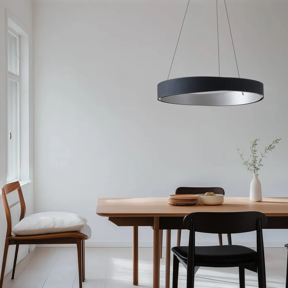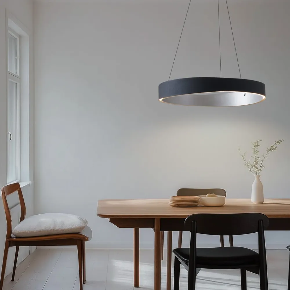 LED-hængelampen Daelor forener moderne design med funktionel alsidighed. Lampen er fremstillet af metal i en stilfuld kombination af sort og aluminium og passer perfekt ind i forskellige indretningsstilarter. Den integrerede LED-lyskilde sørger for energibesparende belysning, der med CCT-funktionen spænder fra varmhvidt lys (3.000 K) til dagslyslignende lys (6.800 K). Lysfarven kan ændres enten trinløst eller i 3 forudindstillede trin. Med en farvegengivelseskvotient på 80 Ra skabes en behagelig og naturlig lysstemning.