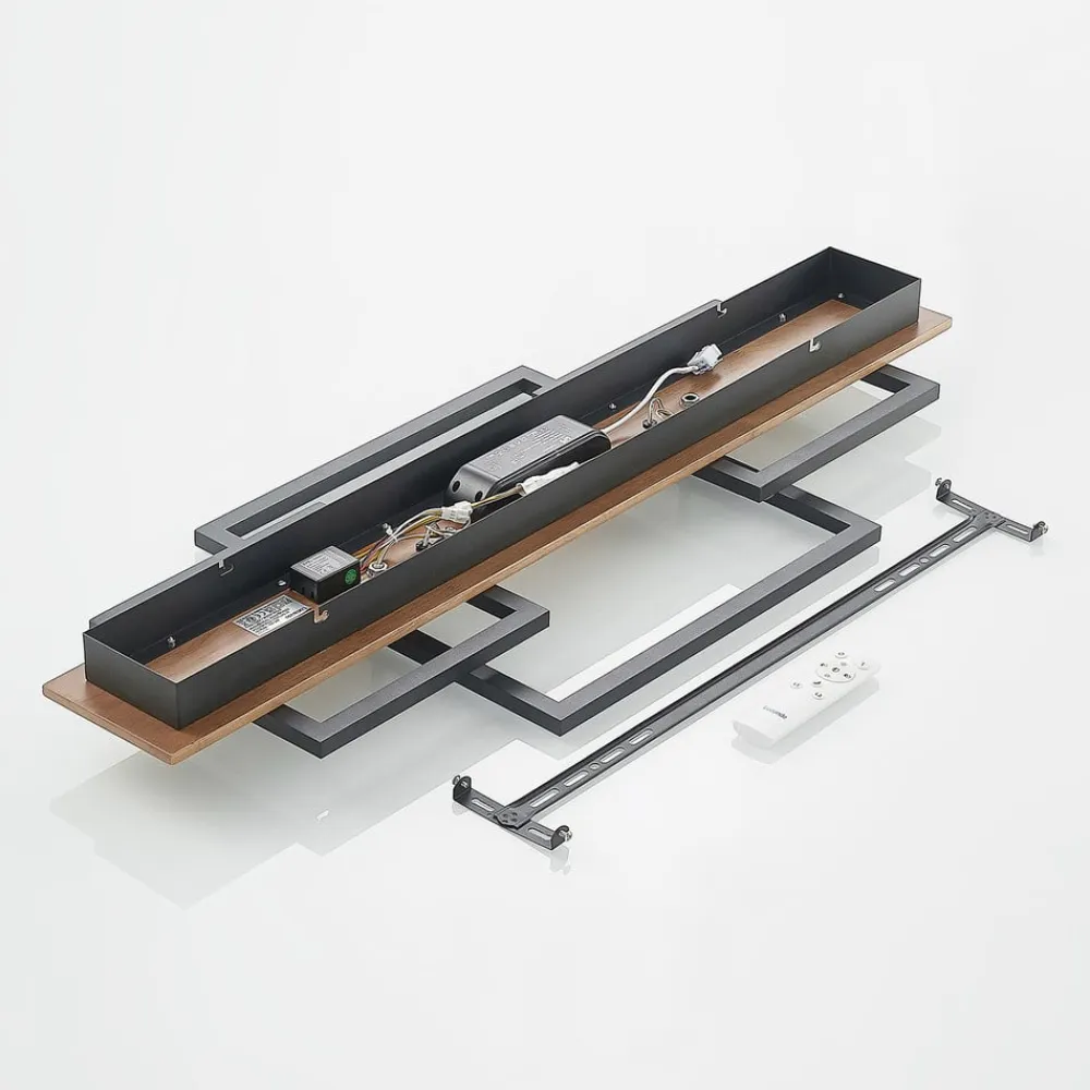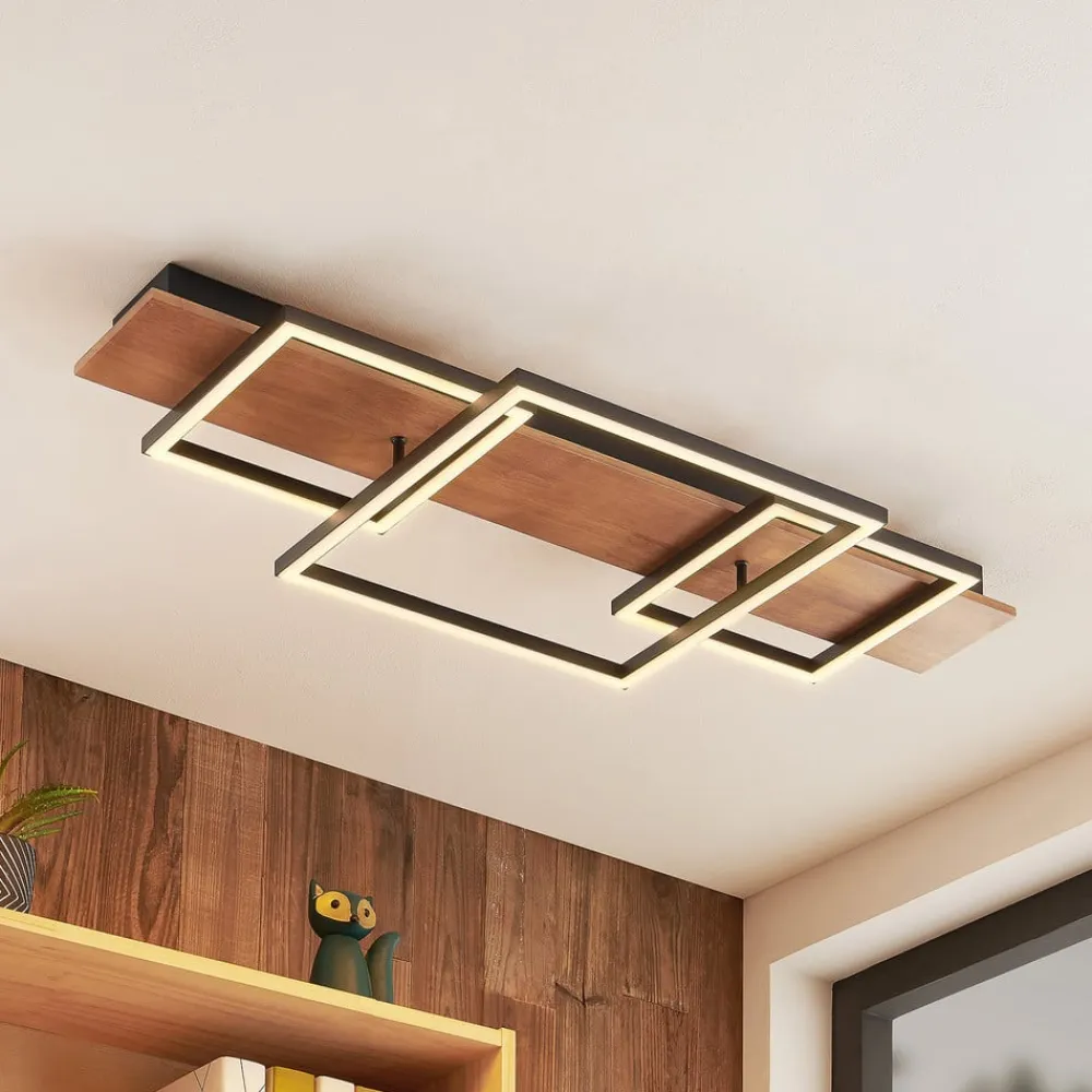 Dæmpbar Chariska LED-loftlampe i træ med tre sorte rammer, farveskift og eksklusivt design Chariska imponerer med et iøjnefaldende look bestående af tre indrammede lysende firkanter og en mørk træplade, der kombinerer naturlighed og modernitet på bedste vis. LED-loftlampen har et eksklusivt design, som gør den til en umiskendelig lyskilde, der fungerer godt i både skandinaviske interiører og moderne stilarter. LED-loftlampen har en lang række tekniske funktioner og kan justeres med hensyn til både lysstyrke og lysfarve. CCT-funktionen kan styres både via kontakten (5 tilstande) og fjernbetjeningen (8 tilstande), der er inkluderet i leveringsomfanget, og kontinuerlig justering er også mulig. Dette gælder også for lysstyrken, da lyset også er trinløst dæmpbart. Derudover kan der tændes for en natlystilstand, og der er integreret en hukommelsesfunktion, som betyder, at de valgte indstillinger bevares, hvis lyset har været tændt i mindst 6 sekunder og derefter slukket i mere end 10 sekunder. Det betyder, at man ikke behøver at gøre sig den ulejlighed at finde de ønskede indstillinger hver gang, men i stedet straks har den ønskede belysning, indtil en anden indstilling anses for at være bedre.