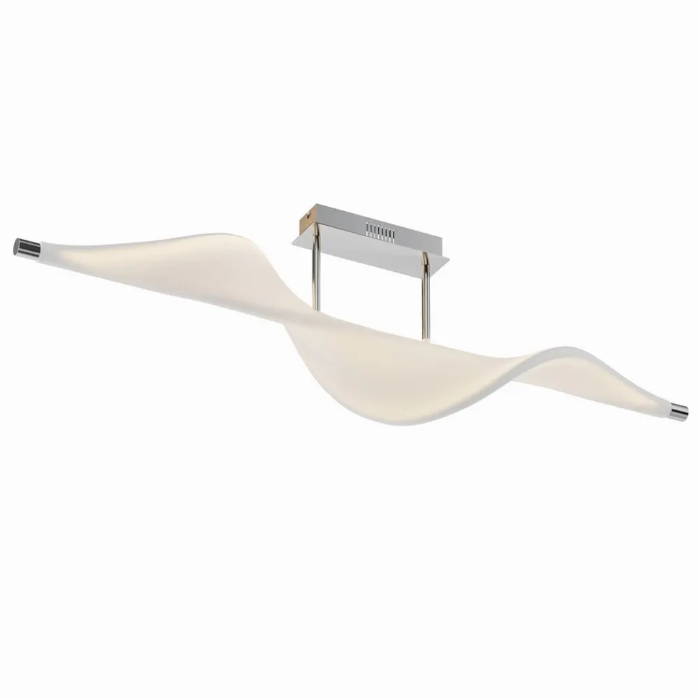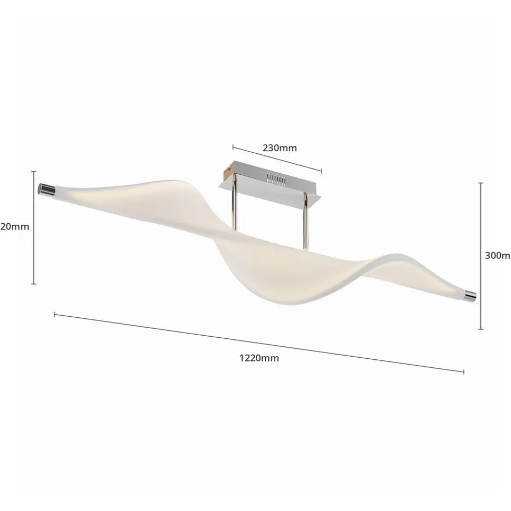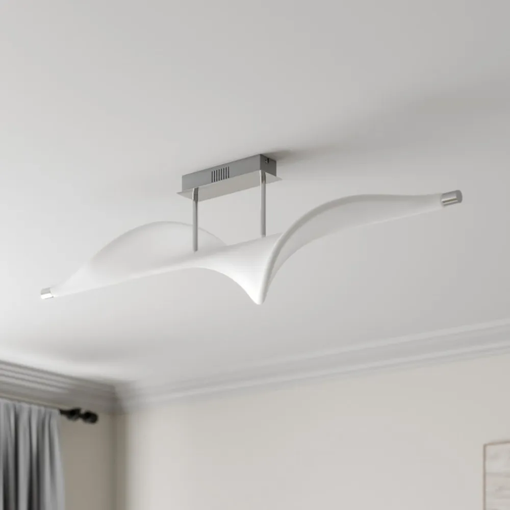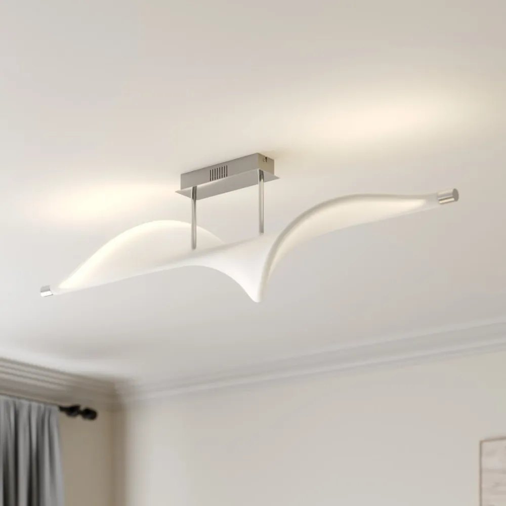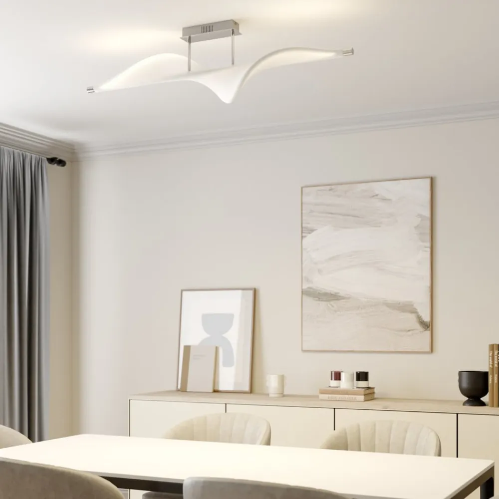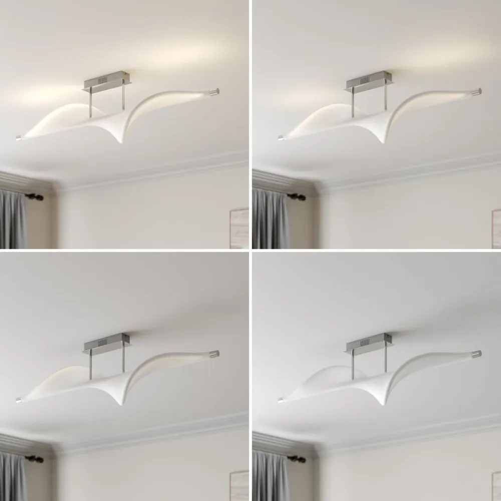 Edano LED-loftlampe med bred stofskærm, stepdim-funktion via kontakt Edano-loftlampen ligner en fugl, der sejler i vinden med vidt udbredte vinger med sin hvide tekstilskærm, som har en buet form og er ophængt i en lille afstand fra loftbeslaget af aluminium. Den moderne LED-loftlampe imponerer med sit usædvanlige design og sin størrelse, hvilket gør den ideel til en stor stue eller et soveværelse. Den spotlight et varmhvidt lys, der kan skiftes til tre forskellige lysstyrkeniveauer ved hjælp af enhver standard lyskontakt og kan derfor dæmpes uden behov for at installere en ekstra lysdæmper. Lyset kan skiftes til 100 %, 40 % og 10 % lysstyrke via lyskontakten, så den rigtige belysning kan vælges til enhver tid. 3-trins dæmpbar + slukket: Lyset kan tændes og slukkes som normalt ved hjælp af en vægkontakt. Takket være 3-trins-dæmpningsteknologien med integreret slukfunktion kan den også dæmmes til tre forskellige lysstyrker ved at trykke flere gange på kontakten: 100 %, 40 % og 10 %.