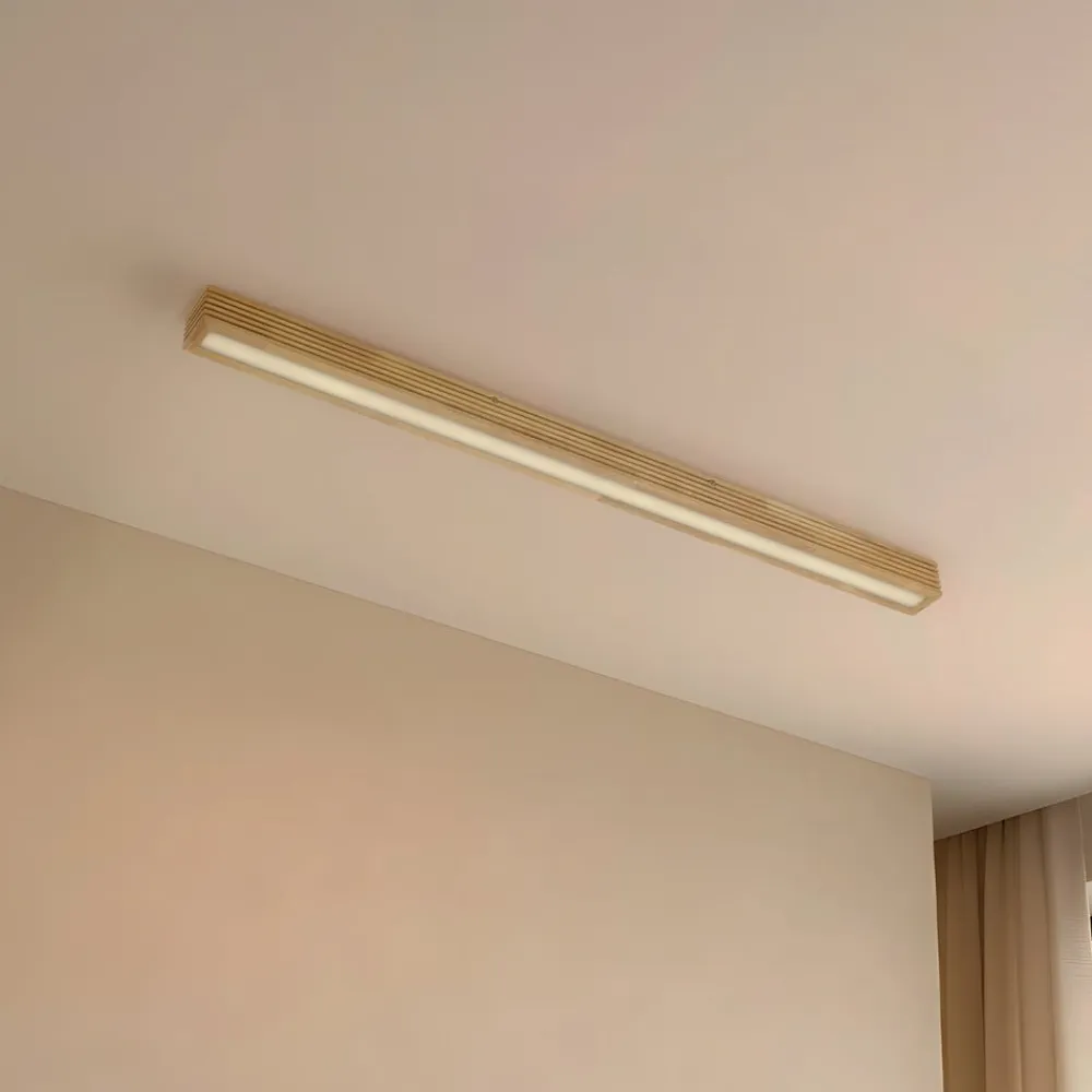 Den rektangulære LED-loftlampe Emara forener stilfuldt design med funktionel belysning. Denne lampe er fremstillet af egetræ og imponerer med sit naturlige, lyse trælook med sans for bevidste detaljer, der giver ethvert rum en varm og indbydende atmosfære. Den integrerede LED-lyskilde sikrer energibesparende lys med varmhvid lysfarve, der skaber en hyggelig stemning.