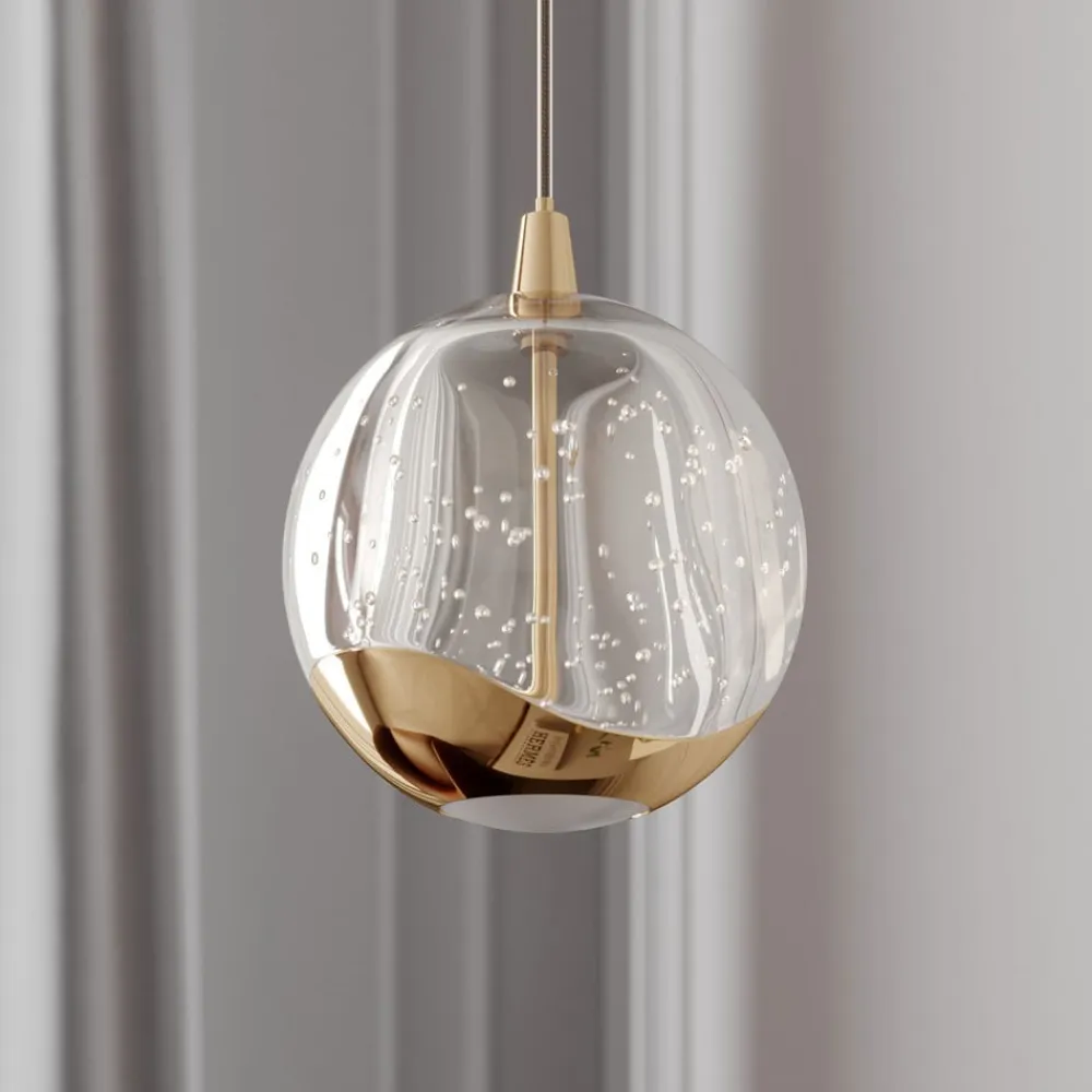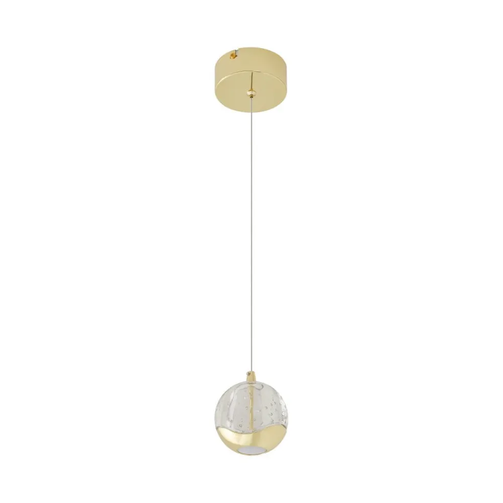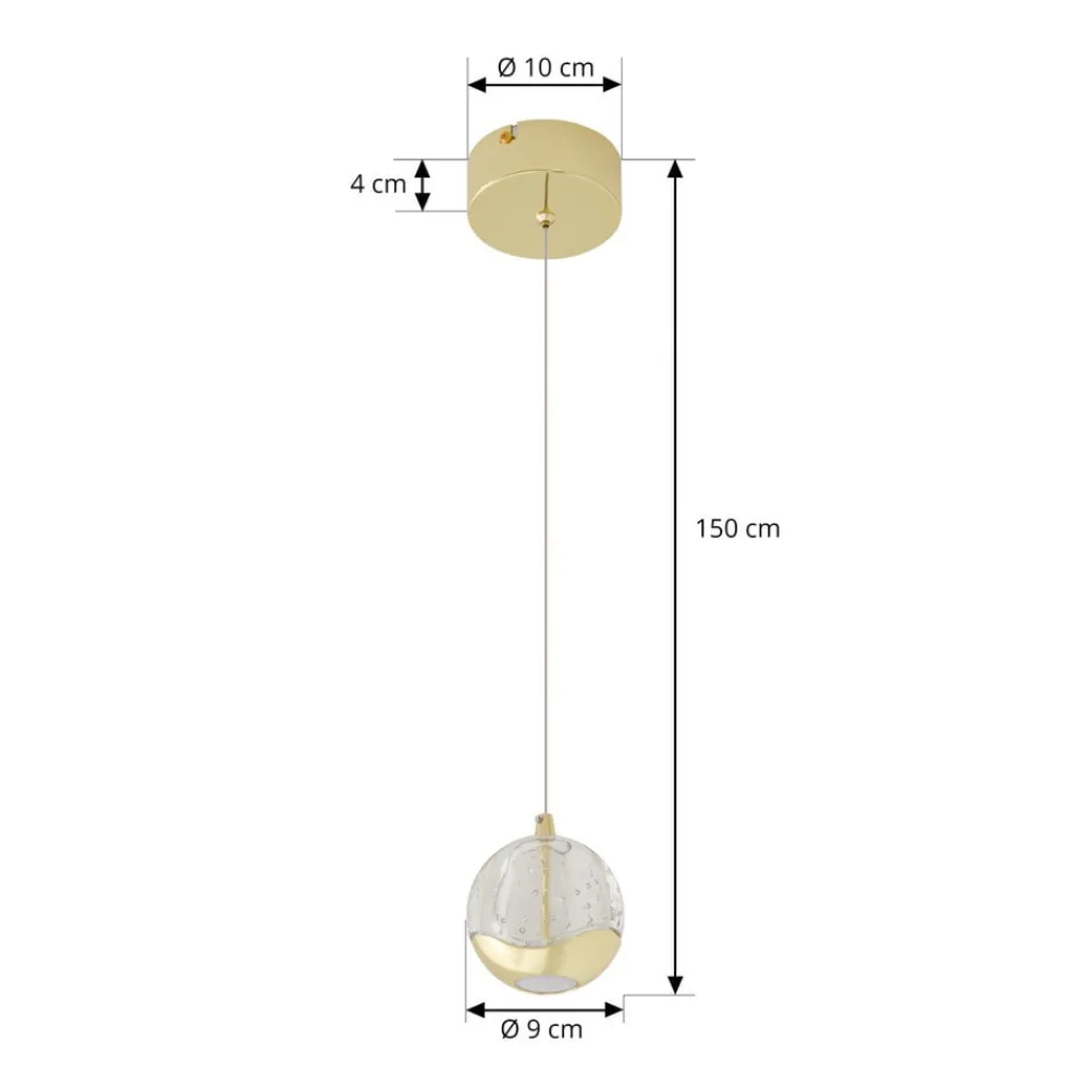Sfærisk LED-hængelampe Hayley med guldfarvede elementer og en glasskærm med boblestruktur Hayley har et slående udseende og er en kompakt LED-hængelampe, der kan bruges i en række stuer, hvor den bliver et dekorativt blikfang. Du kan også bruge flere lamper på række, f.eks. til at oplyse en disk. LED’erne er både effektive og energibesparende, hvilket giver en god lysstyrke med et lavt strømforbrug. Glaskuglen har en interessant overflade med boblestruktur, og på undersiden er der et metalelement, der ligesom loftbeslaget er udført i en skinnende guldtone, hvilket giver pendellampen et klassisk look. Lysudsendelsen er ikke kun direkte, men også indirekte, hvor den direkte lyskomponent fremstår så blød og hyggelig som muligt takket være et hvidt glaselement.