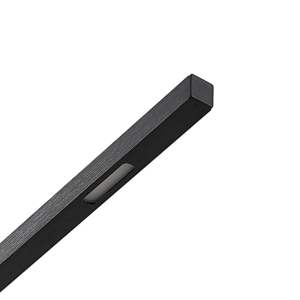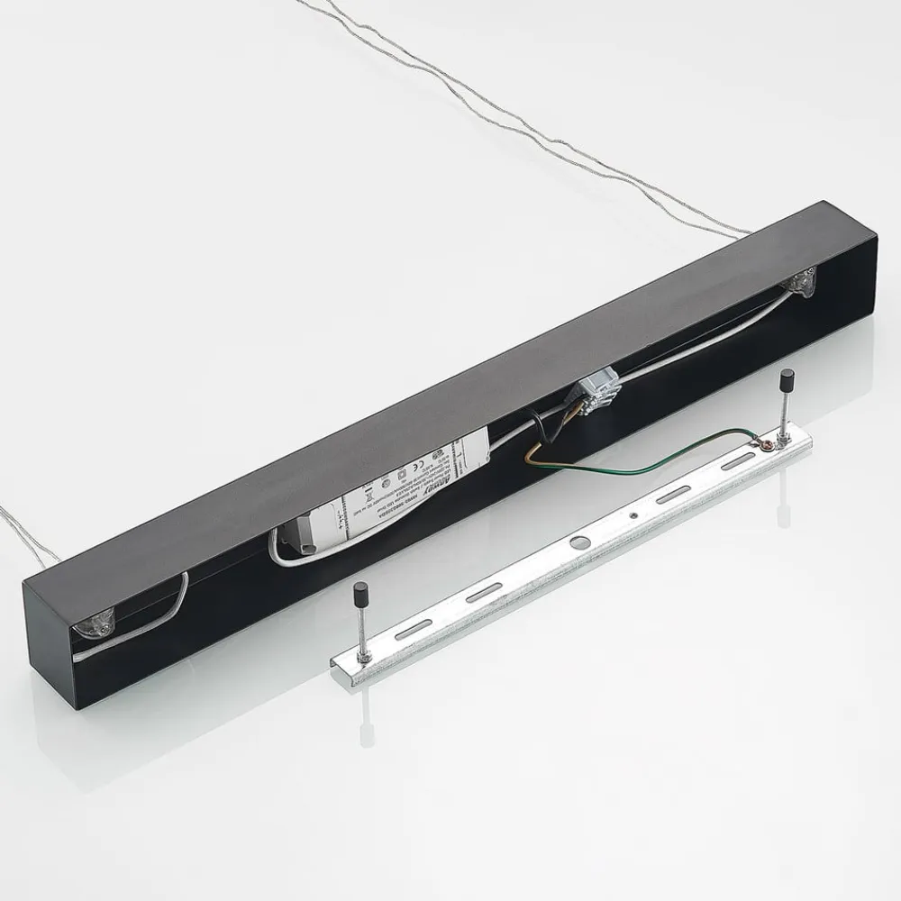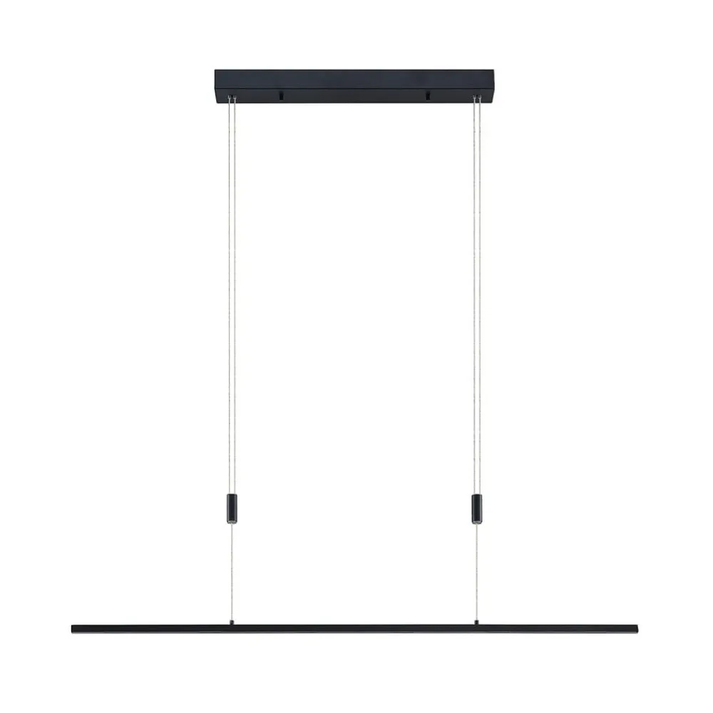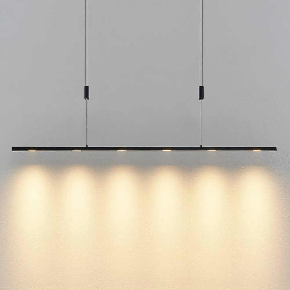 Højdejusterbar Stakato LED-pendel i mat sort, 6 lyskilder Skærmen på Stakato LED-hængelampen er lang og smal og lavet af aluminium, hvor seks LED-moduler er jævnt fordelt bag akrylafdækninger. De spotlighter et varmhvidt lys nedad, hvilket gør hængelampen til den ideelle lyskilde over spisebordet eller en køkkenø i moderne indrettede rum. Lampen imponerer med sin høje grad af funktionalitet. Ikke alene kan ophængningen af det lange lyselement varieres i området fra 110 til 210 cm med få enkle trin, lysintensiteten kan også skiftes til tre forskellige lysstyrker uden at skulle installere en dæmper ved hjælp af den eksisterende lyskontakt. En vægkontakt kan bruges til at tænde og slukke lyset som normalt. Takket være 3-trins dæmpningsteknologien med integreret slukkefunktion kan den også skiftes til tre forskellige lysstyrkeniveauer (100 %, 50 % og 10 %) ved at trykke på kontakten flere gange.