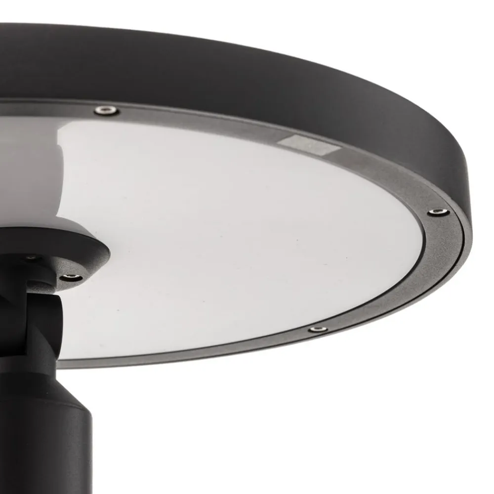 Akito LED-lygtepæl med rund, flad lampeskærm Denne LED-lygtepæl er ideel til belysning af større haver og parker. Den har et meget moderne look med en rund ring i toppen af stolpen, der er udstyret med mange LED’er og ligesom resten af lygtepælen er malet mørkegrå. Armaturets lysstyrke er særlig god, så du kan orientere dig relativt godt selv på afstand.