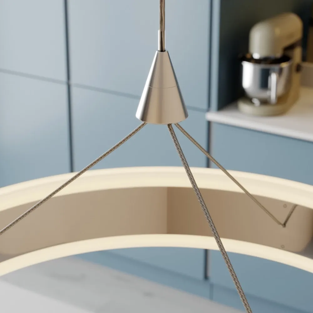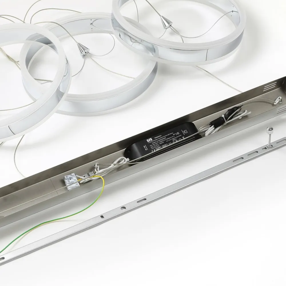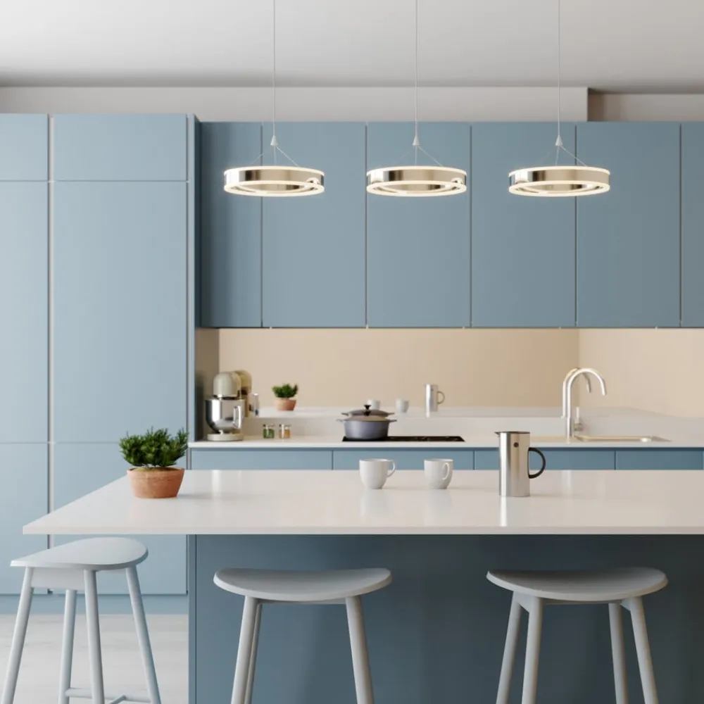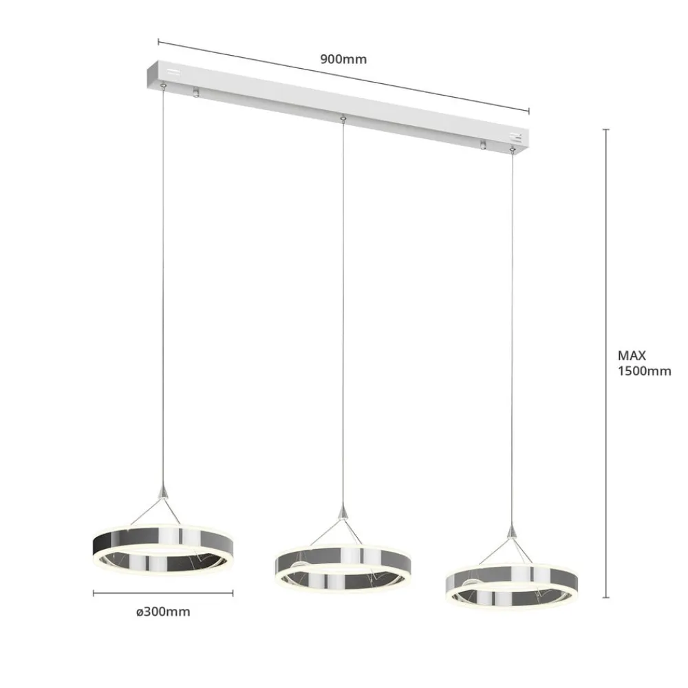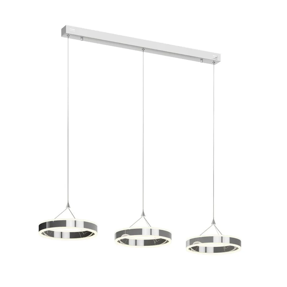 Ideel til spisebordsbelysning: den 3 lyskilder store Lyani hængelampe med dæmpbare LED’er Tre ringe af forkromet metal er hovedkomponenterne i Lyani LED-hængelampen. Sammen giver de et stærkt lys, men du har også mulighed for at justere lysstyrken i tre trin for at få lyset til at virke mere hyggeligt. Denne funktion styres via den normale vægkontakt. Med sit kromdesign og ringformede lampeskærme udstråler LED-hængelampen et særligt moderne look.