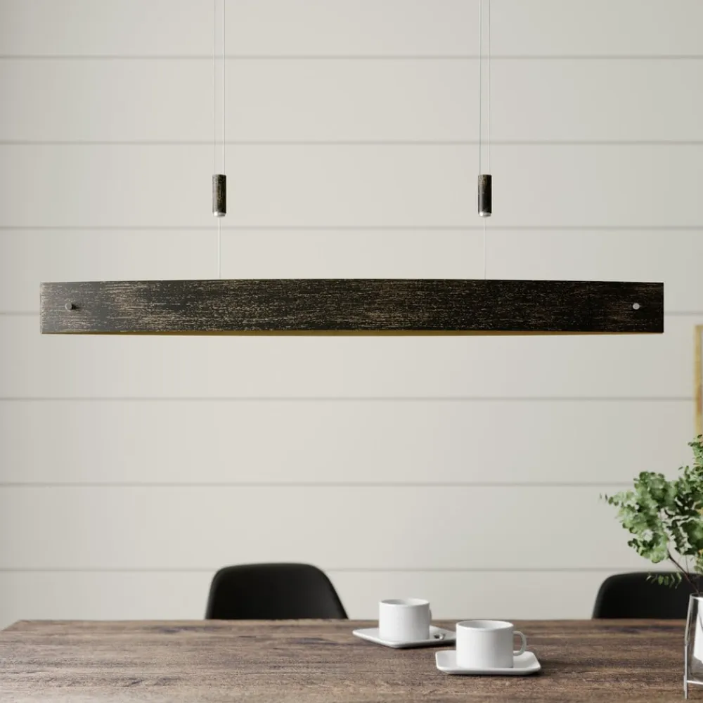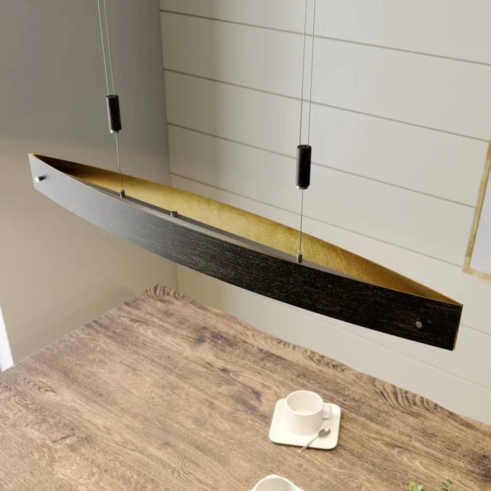 Lio udmærker sig gennem dens varme hvide lys, der udstråler en hjemlig hygge. Denne LED-hængelampe kan monteres over et spisebord, hvor den vil komme til god anvendelse. En anden fordel er at den kan justeres i højden, dermed kan Lio nemt ændres i højden fra 110 cm til 200 cm, hvormed den perfekte belysning af spisepladsen opnås. Den indvendige del af skærmen, der består af to lange metalbuer, er belagt med en varm guldfinish, hvormed der udsendes et hyggelig lysskær. På ydersiden er den moderne skærm lakeret sort, og derefter tilføjet en børstet guldfinish, som skaber et individuelt udtryk.