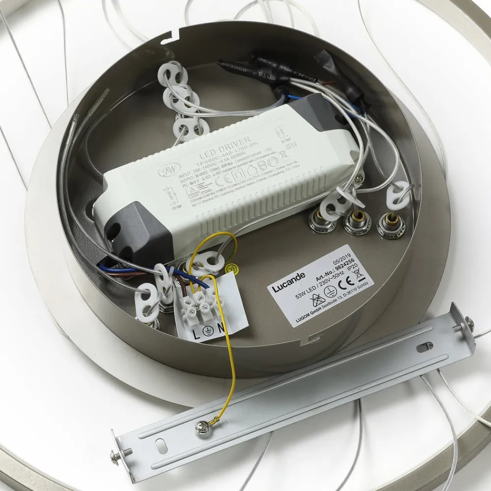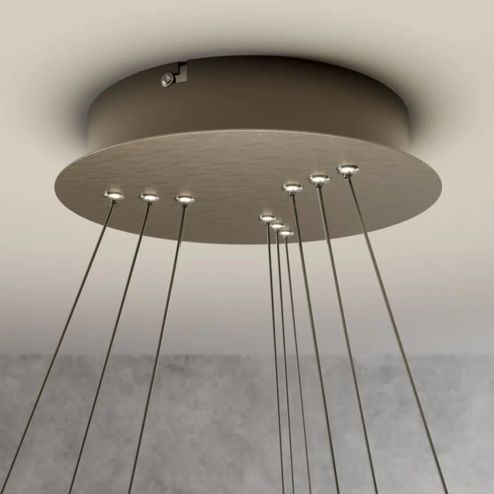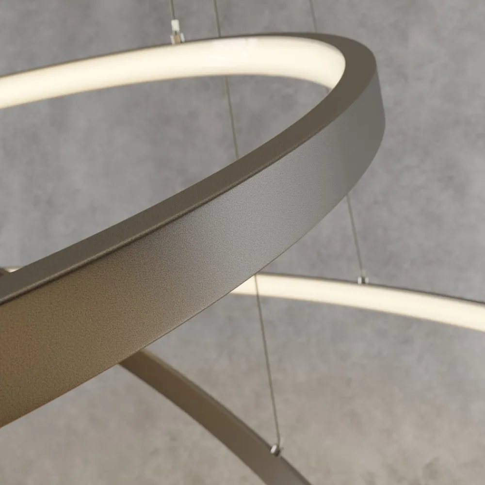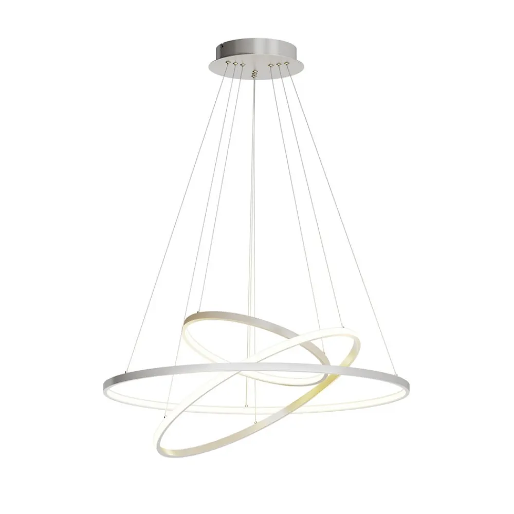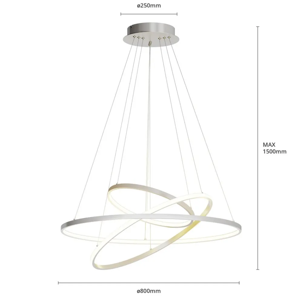 ophænget består af ni tråde, der placerer ringene i forskellige vinkler. Takket være LED-strip på siderne af ringene lyser lampen både indad og udad. Med dæmpningsfunktionen (via tre trin på kontakten) kan lysstyrken desuden varieres efter ønske. På denne måde oplyser pendellampen rummet på en stemningsfuld måde.
