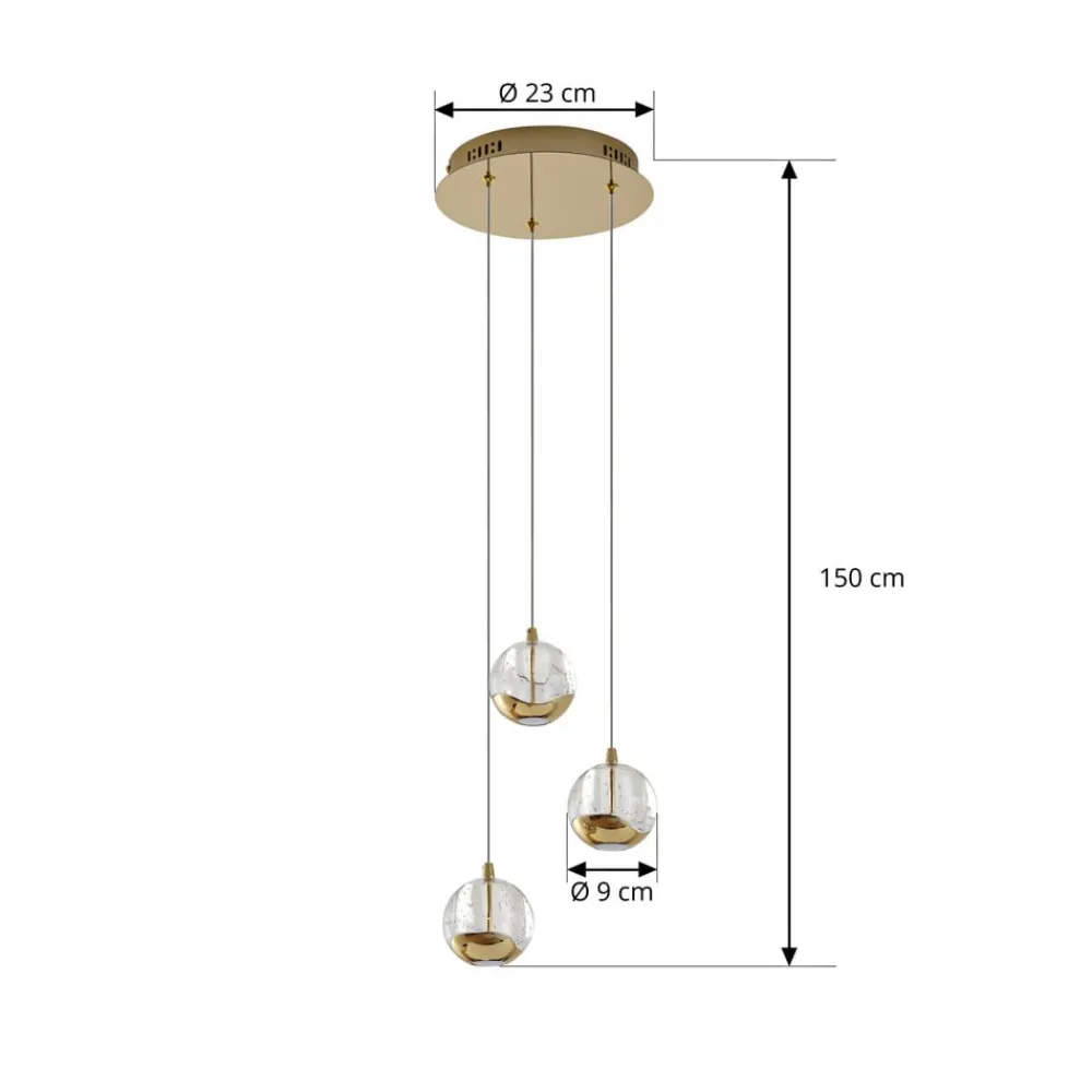 Hayley LED-hængelampe med tre glaskugler og metalelementer i skinnende guld Den 3 lyskilder version af Hayley passer godt over et spisebord og imponerer med en særlig glamourfaktor, som udgøres af det spotlight funklende bobleglas og metalelementerne i guld. Skærmene har et kompakt design og er alle kugleformede. Den største del er lavet af det attraktive bobleglas, men i bunden er der et metalelement i en skinnende guldtone, mens den direkte lysemission i bunden er blødere og mere jævn takket være et element lavet af hvidt glas, der næsten ikke skaber nogen blænding. Et ægte HighLight med iøjnefaldende kvaliteter!