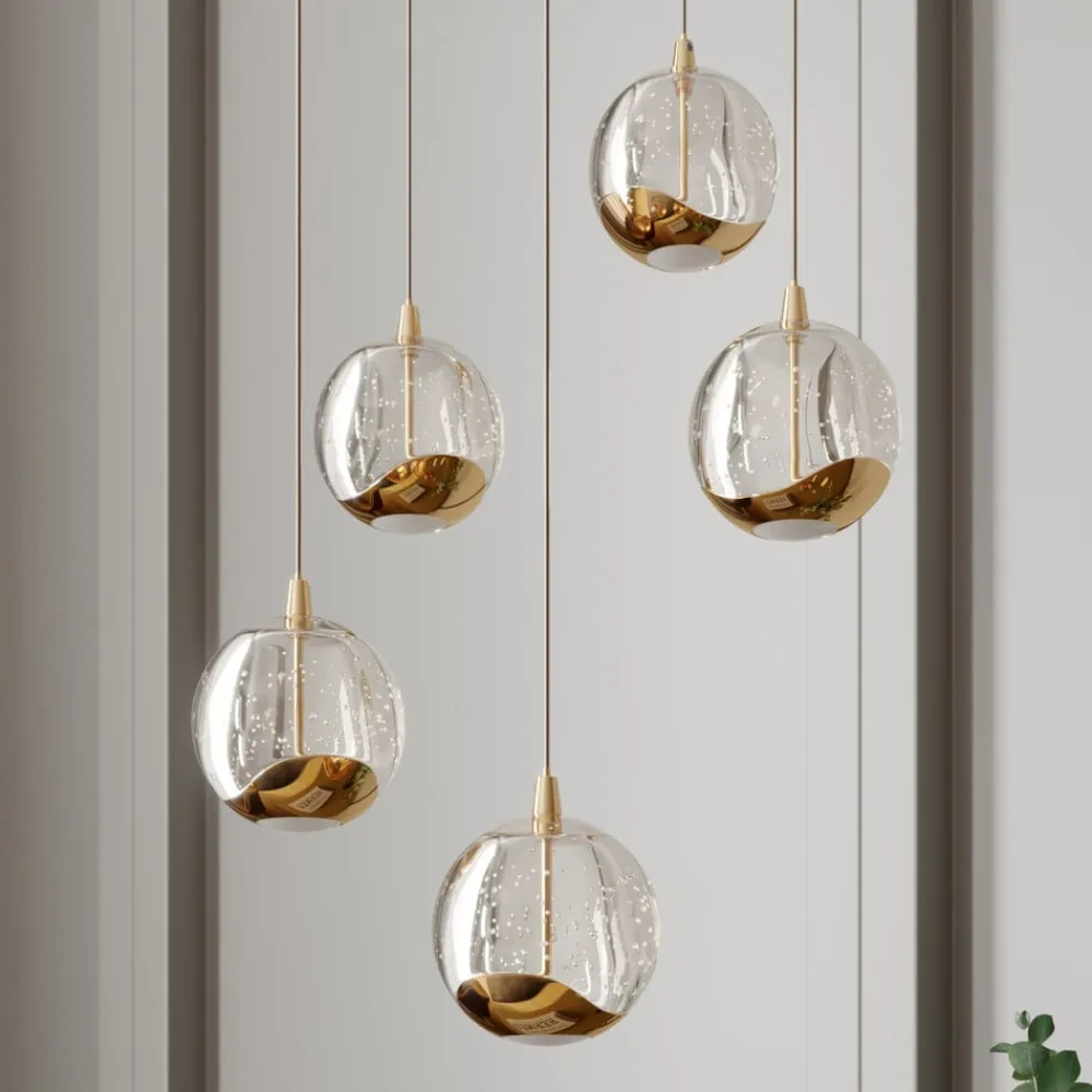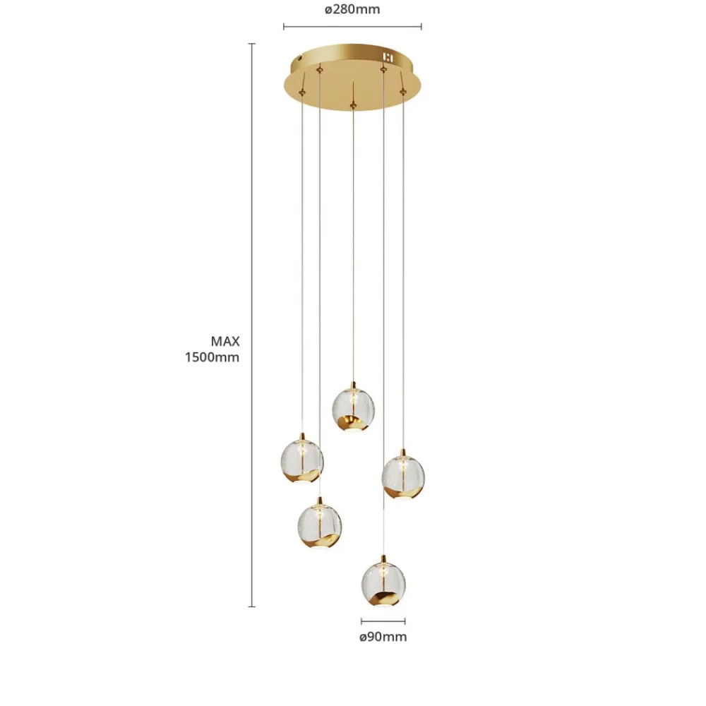 Guldfarvet LED-pendellampe Hayley med fem glaskugler med attraktive bobler Hayley er en pendellampe med stil og ynde, der ikke vil se malplaceret ud i klassisk interiør takket være de guldfarvede metalelementer. De fem skærme er lavet af klart glas med boblestruktur og er på undersiden afsluttet med den guldfarvede metaldekor. De udsender LED-lyset både direkte og indirekte, selv om der er et hvidt glaselement på undersiden, som får lyset til at virke blødere og mere hyggeligt. Samlet set kan man sige, at Hayley skaber en funklende lysoplevelse med specialeffekter og et imponerende spotlight. LED-teknologien sikrer et lavt strømforbrug med god effektivitet, hvilket skaber et klart lys. Pendellampen er den ideelle tilføjelse til belysningen i spiseområdet.