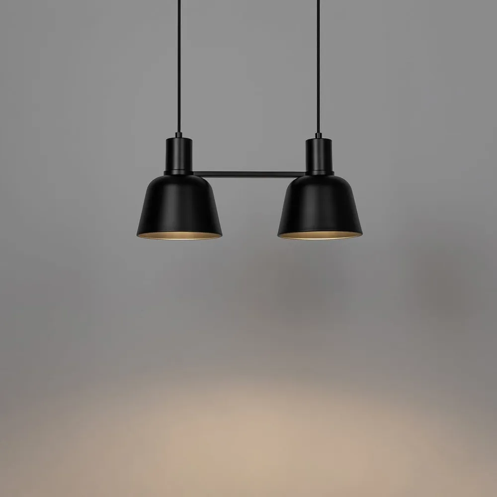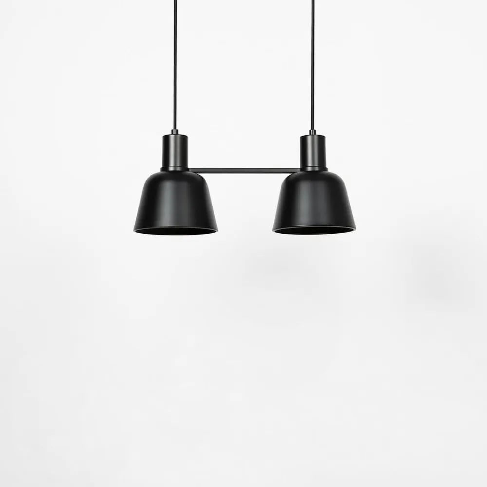 To-lampe-pendelarmatur Servan i eksklusivt design, sortServan overbeviser med et detalje-reduceret formsprog og er velegnet til køkkenet eller et spisebord i stuen, hvor montering over en bordplade også er meget tænkelig. Den har to sorte lampeskærme af metal, som er uigennemsigtige, så lyset udelukkende sendes nedad. Designet er uden specielle detaljer eller overflødige funktioner og fokuserer på det væsentlige, så lampen også kan integreres meget smukt i skandinavisk interiør og altid har en stilfuld lyskilde, der genererer et blændfrit og hyggeligt lys.