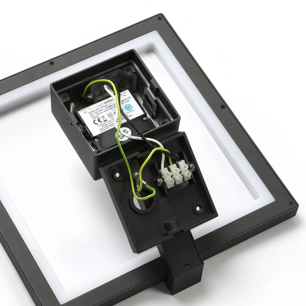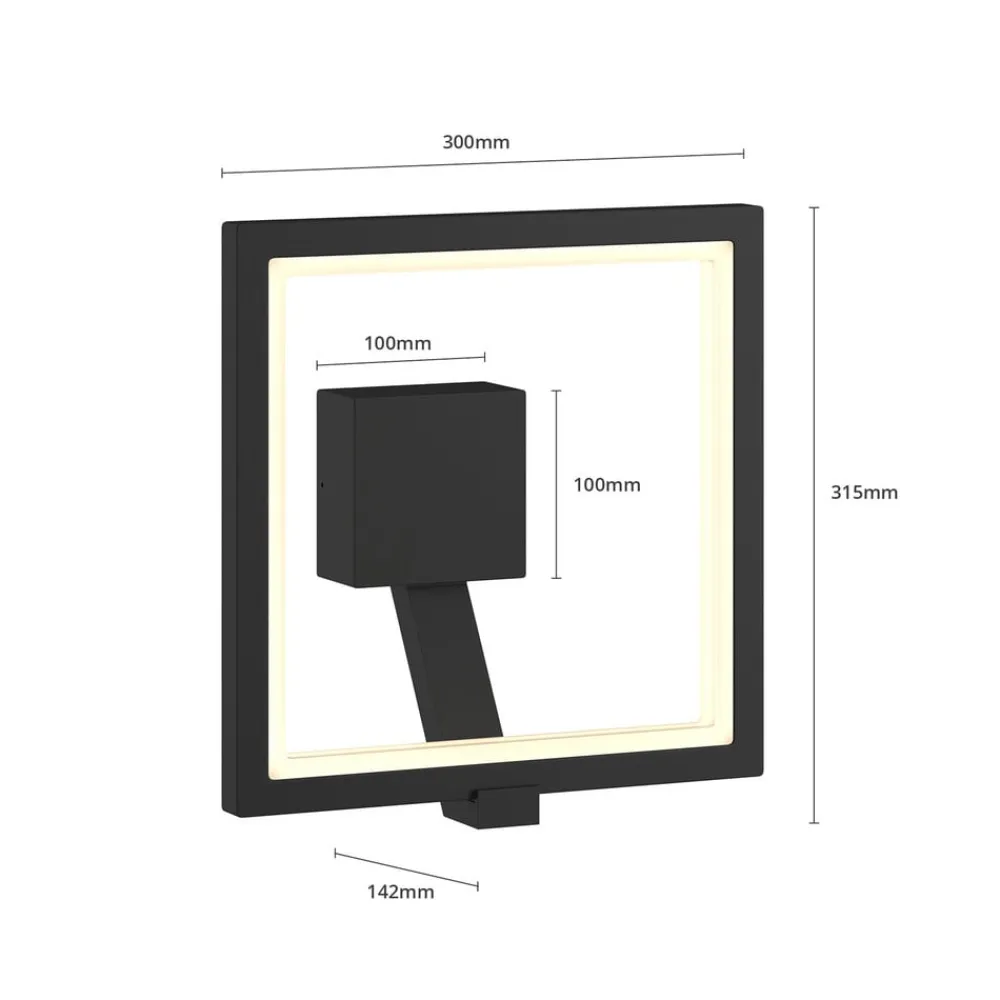 Firkantet, indrammet udendørs LED-væglampe Firkantet LED’erne i denne udendørs væglampe er økonomiske med hensyn til energiforbrug og kan stadig lyse kraftigt. Den firkantede ramme på den udendørs væglampe er lavet af grafitgråt aluminium og minder om en ramme, hvilket skaber et moderne, puristisk look, der passer godt til moderne arkitektur.