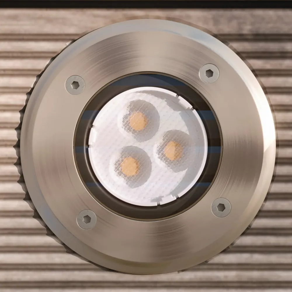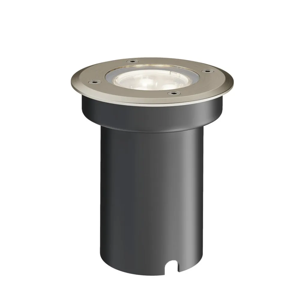 Ava rund nedgravningslampe med kant i rustfrit stål og varmhvide Cree-LED’er Ava LED nedgravningslampe til udendørs brug har et relativt klassisk design og kan derfor bruges på mange forskellige måder. Den integrerede LED-teknologi er derimod ekstremt moderne og fremtidsorienteret med 3 lysdioder på hver 1 watt, der lyser i en varmhvid lysfarve. Den matchende indbygningsboks og skruer er allerede inkluderet i leveringsomfanget, og tilslutningskablet har en åben ende. Der er mulighed for gennemgående ledninger, så flere armaturer kan placeres på række, hvis det er nødvendigt, uden at der er behov for en separat strømtilslutning til hver af dem, da et andet valgfrit kabeludtag (det matchende tilbehør er inkluderet i leveringsomfanget) gør det muligt at føre ledninger videre til det næste armatur. Med en kapslingsgrad på IP67 er det omfattende beskyttet mod indtrængen af snavs og fugt. Nedgravningslampen kan overkøres og belastes med op til 500 kg. Generelle oplysninger om nedgravningslamper: For at få glæde af nedgravningslamperne i lang tid skal der sørges for effektiv dræning og et passende grusbed til afvanding. Nedgravningslamper må ikke installeres i hulrum eller fordybninger – der må ikke samles stående vand på armaturet (eller i den indbyggede boks).