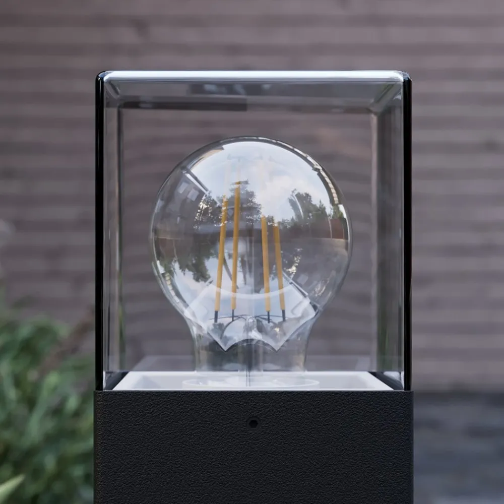 Keke sokkellampe i moderne geometrisk form Uanset om det er i indkørsler, på havestier eller i husets indgangsparti, giver den moderne Keke sokkellampe sikker og pålidelig belysning i udendørs områder. Den har et moderne design og imponerer med sin kantede form og harmoniske farveskema. Huset består af grafitgråt aluminium med en røggrå plastskærm på toppen. Dette omslutter pæren sikkert, så vind og vejr ikke kan forårsage skade.
