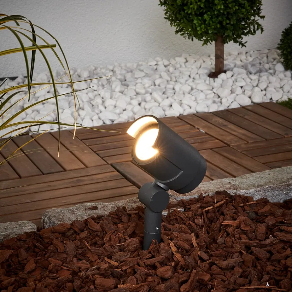 LED-spot med jordspyd Beatrix med mørkegrå overflade Beatrix er en fantastisk lyskilde til haven og til plantebede. Spotlightet forankres fast i jorden med jordspyddet og kan derefter tages i brug. Et spot med jordspyd kan f.eks. bruges udendørs til at belyse og fremhæve visse genstande på en smuk måde. Du kan justere justeringen af Beatrix lampehoved en smule ved at bruge en skruetrækker, justere positionen og derefter stramme skruen igen. Hvis du finder ud af, at lysets nuværende position ikke længere er passende, kan du trække det op af jorden og flytte det til et andet sted med relativt få skridt, da det trods alt er et mobilt lys. Et smukt HighLight til haver og forhaver!