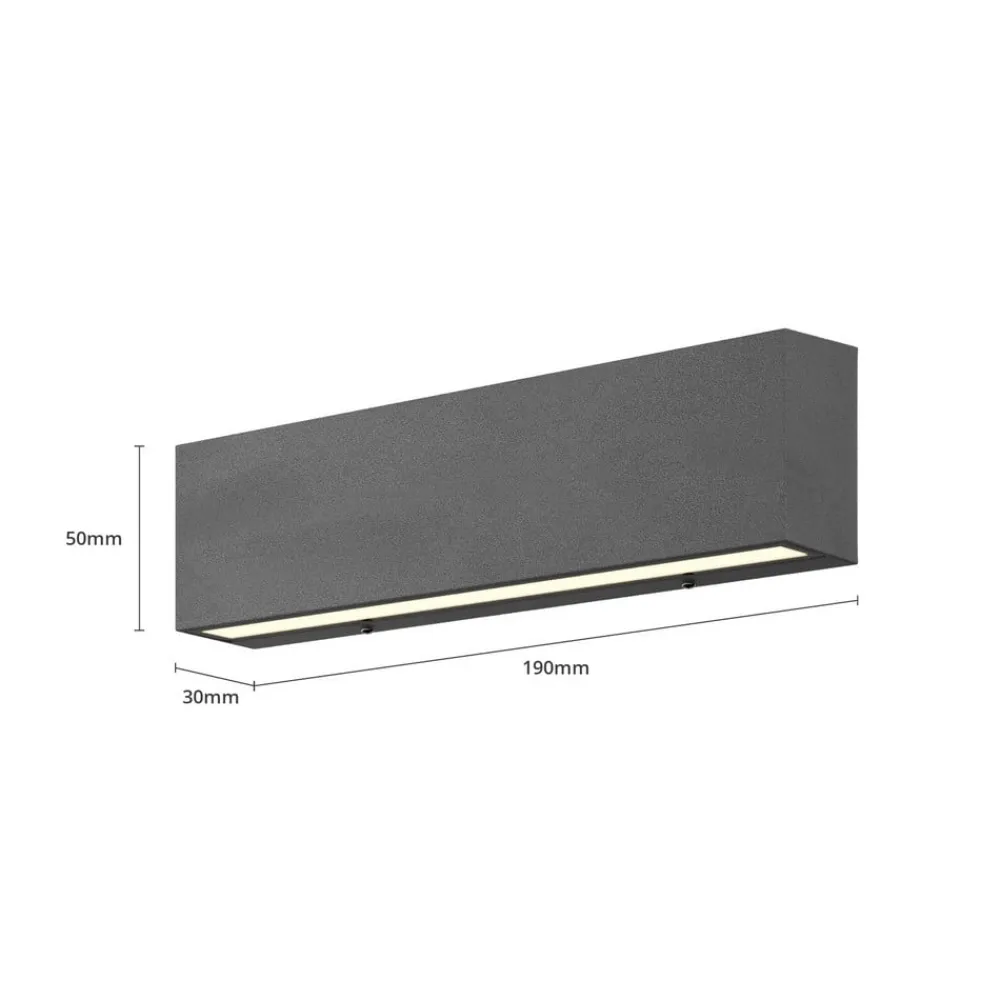 Rektangulær udendørs LED-væglampe Elvira Elvira har et meget enkelt design, så den ikke kun passer til mange stilarter, men også ser ekstremt moderne ud. Overfladen på aluminiumskroppen har en grafitgrå finish. LED’erne er et mærkevareprodukt fra Toshiba og er langtidsholdbare og energieffektive.