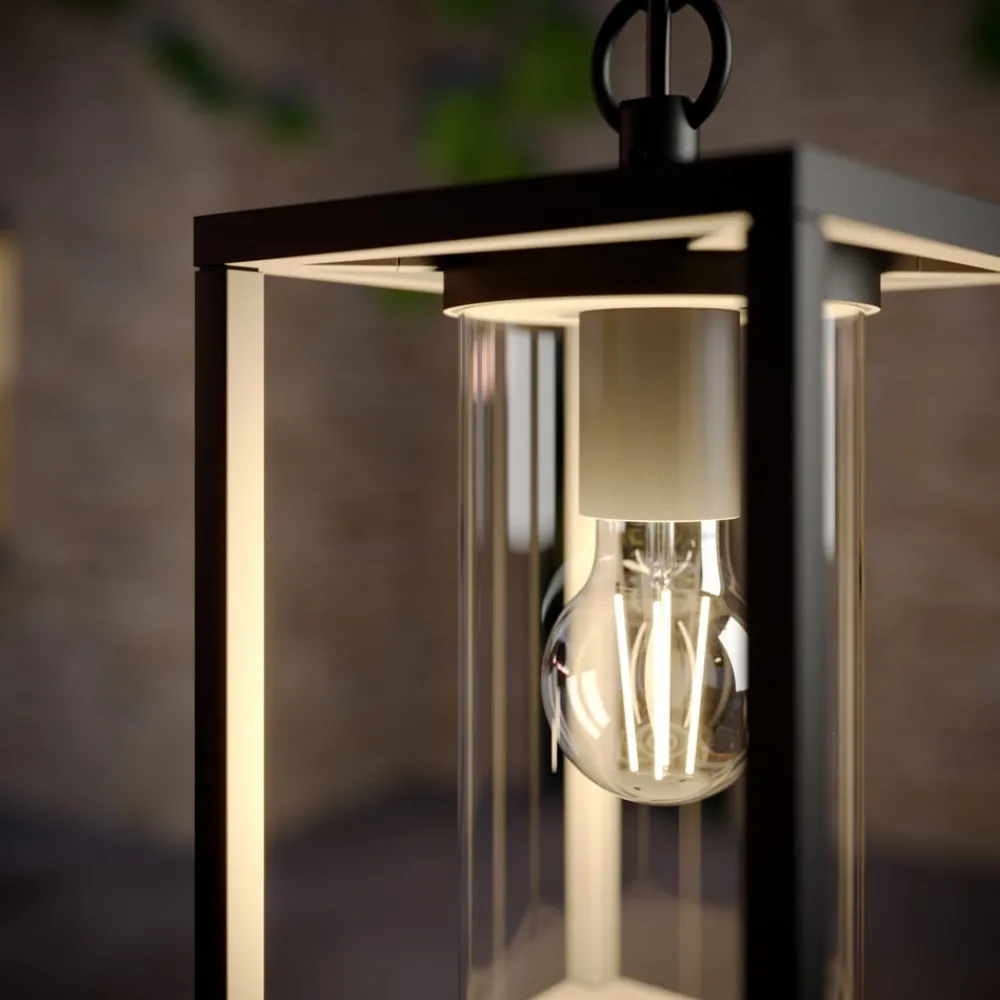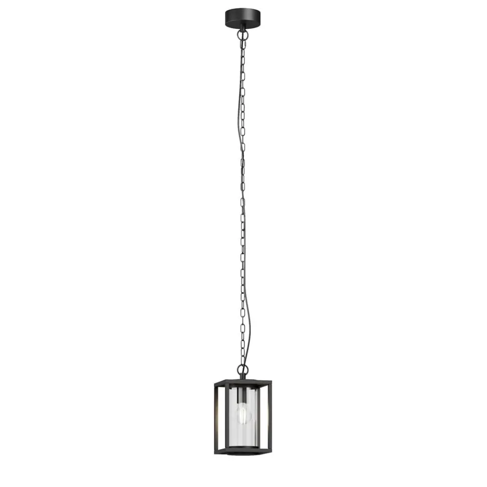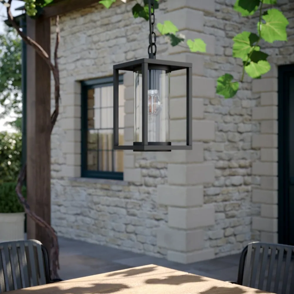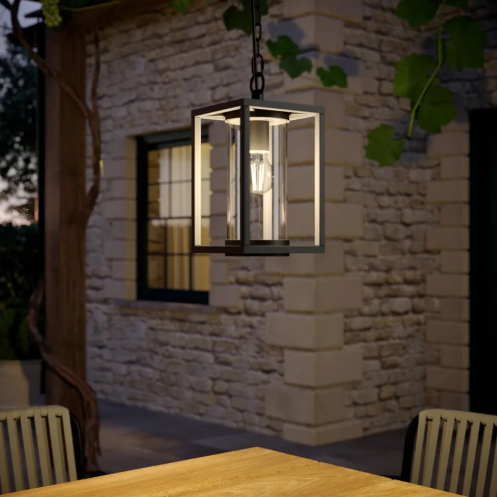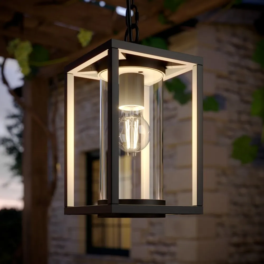 Ferda – hængelampe til udendørs brug Den moderne udendørs hængelampe Ferda er lavet af antracitfarvet aluminium. Lyset her kommer fra en E27-lampe, som kan vælges frit. Den er beskyttet på alle sider af en gennemsigtig glascylinder, som sikrer, at vind og vejr ikke kan skade teknologien indeni, og som også sender lyset jævnt ud i omgivelserne. Den udendørs hængelampe udsender et behageligt, varmhvidt lys, der skaber en hyggelig atmosfære. Uanset om det er terrasser, verandaer eller andre overdækkede udendørsarealer, kan de alle få gavn af den udendørs hængelampe Ferda.