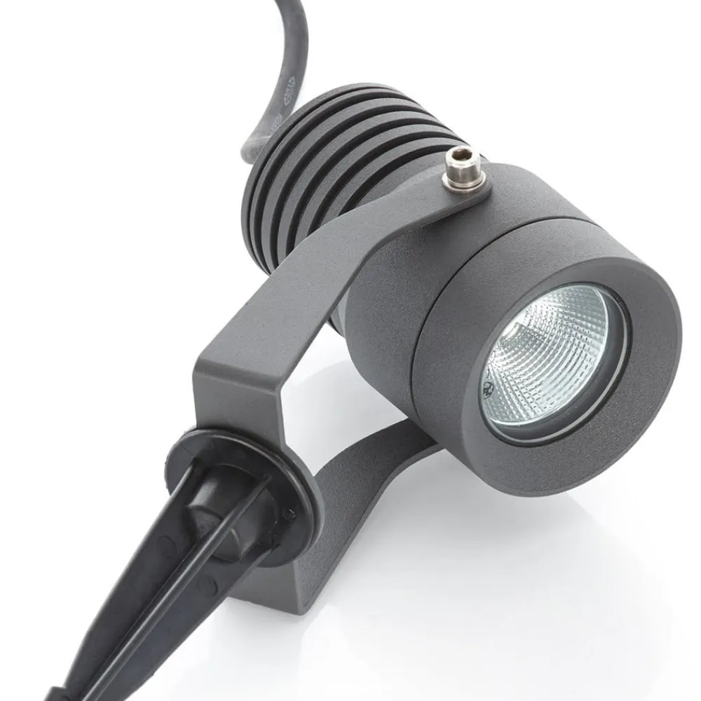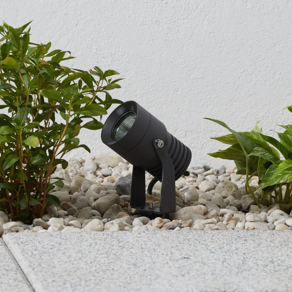 Fleksibel udendørs LED-spot Jon i mørkegrå med kapslingsgrad IP65 Den udendørs LED-spot Jon kaster lyset præcis derhen, hvor der er brug for det. Det gør udendørslampen til en fleksibel og alsidig belysningsløsning til udendørsarealer, som også imponerer med sit moderne design. Spotlighten har et bevægeligt lampehoved og kan derfor nemt tilpasses forholdene på stedet. Udendørslampens hoved ligner en kameralinse og er fastgjort til to stænger, der ender i beslaget. Samlet set er den mørkegrå, trykstøbte aluminiumsbeklædning meget holdbar og giver lampen et slankt design. Takket være jordspyddet er spotlighten også velegnet til brug i havens bede. Lampen leveres med et praktisk tilslutningskabel på 3 meter. Takket være kapslingsgraden er den også godt beskyttet mod regn og fugt. Klassificering af slagfasthed IK08.