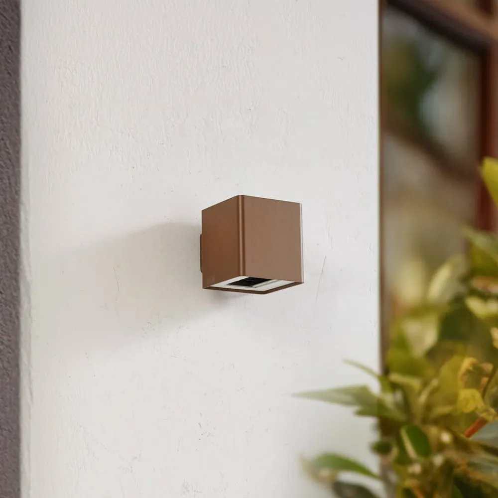 Enkel udendørs LED-væglampe Aaron i trykstøbt aluminium med brun farve Den udendørs LED-væglampe Aaron kombinerer moderne design med funktionel belysning til udendørs områder som terrasser og balkoner. Den integrerede LED-lyskilde giver energibesparende lys, mens kapslingsgraden IP54 beskytter armaturet mod støv og vandsprøjt. Op/ned-effekten skaber en indbydende atmosfære og fremhæver arkitektoniske detaljer. Den brune aluminiumsfinish passer harmonisk ind i omgivelserne og understreger produktets stilfulde modernitet – Justerbar strålevinkel (30° – 130°)