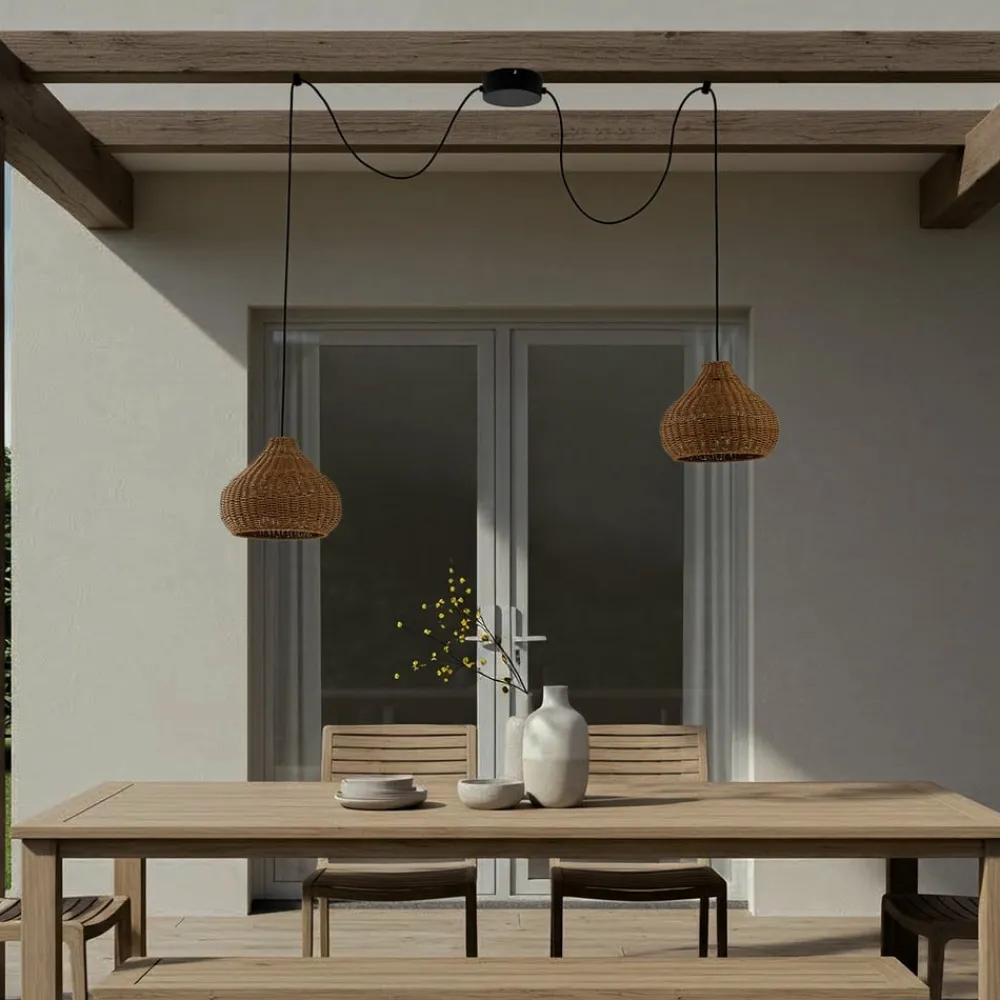 Taniola udendørs hængelampe med to lampeskærme i rattan Oplev, hvordan Taniola udendørs hængelampe ikke kun bringer lys, men også atmosfære til dine udendørsarealer med sit 2 lyskilder design og vævet rattan. Kombinationen af robust rattan og massivt jern giver denne lampe et rustikt præg, der passer perfekt til landhusstilen og skaber et indbydende miljø på terrassen eller altanen. Med en kapslingsgrad på IP44 er den optimalt beskyttet mod indtrængen af fremmedlegemer og vandsprøjt, hvilket gør den til en pålidelig lyskilde udendørs. Det beige og sorte farveskema understreger den naturlige æstetik og passer harmonisk ind i det samlede udseende af dit udendørs område. Selvom der ikke medfølger en dæmper, kan lysstyrken justeres ved hjælp af en ekstern dæmper, så du kan regulere lysintensiteten efter behov. Med den udendørs hængelampe Taniola kan du stole på en kombination af stil og funktionalitet, der bader dit udendørs område i stemningsfuldt lys.