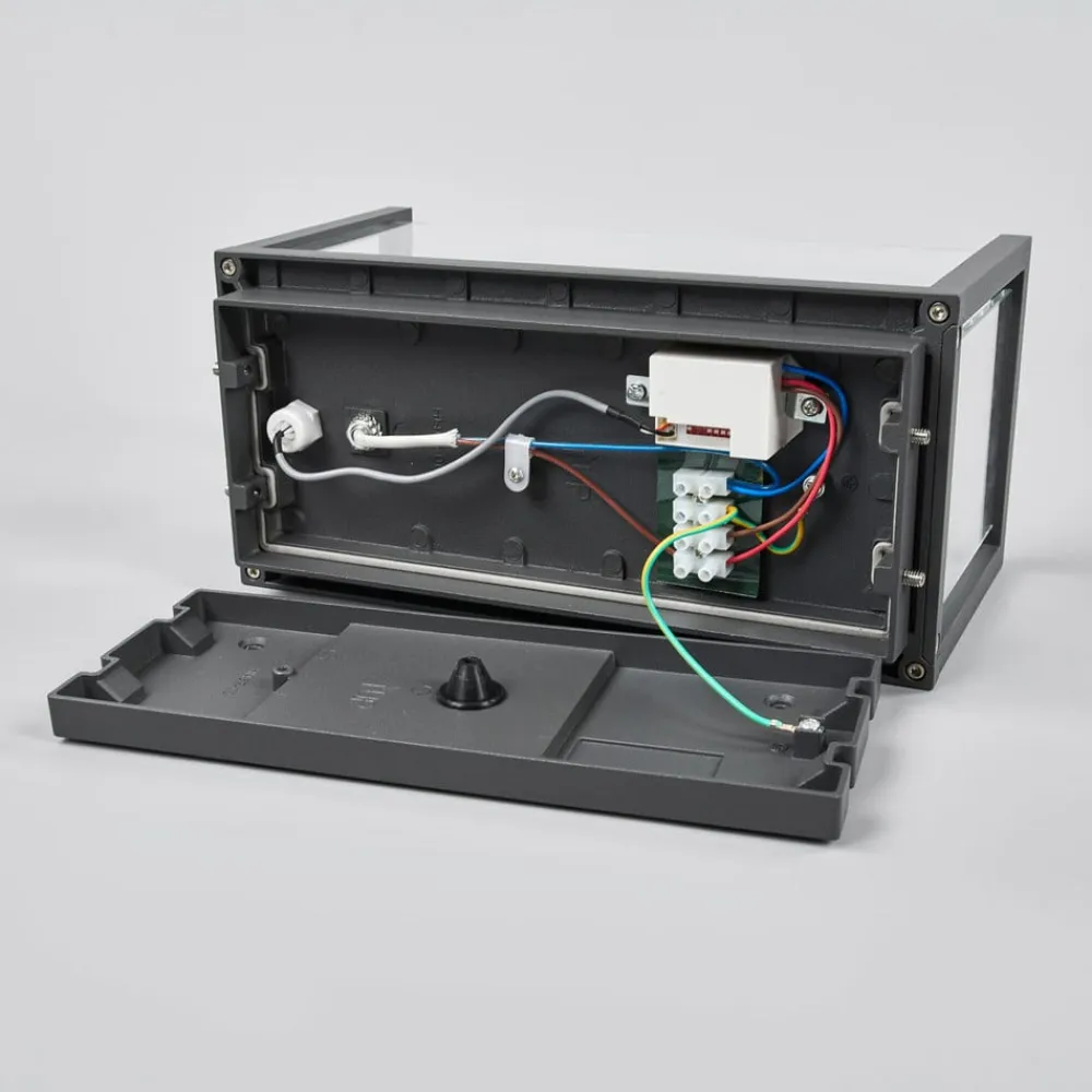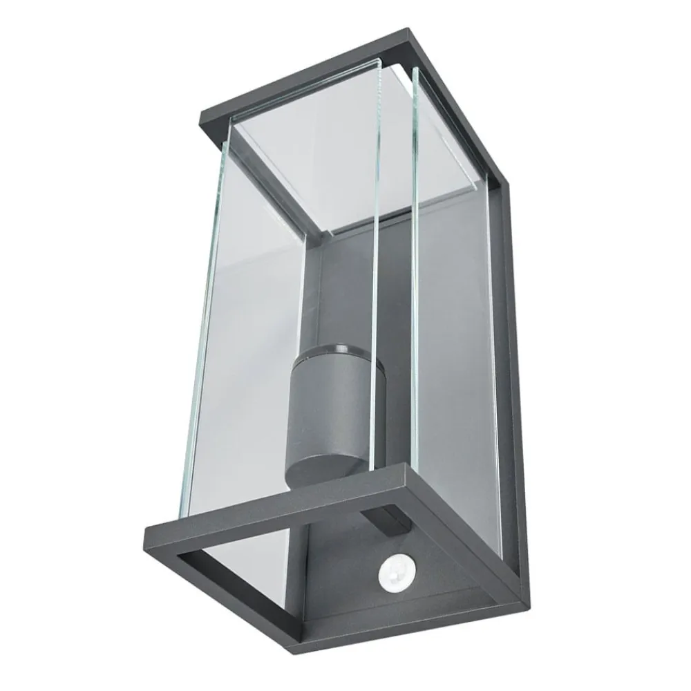 Annalea kantet udendørs væglampe med klare glasruder og integreret bevægelsessensor Annalea har et moderne look, da den udendørs væglampe består af en aluminiumsramme og ekstra glasruder med en klar overflade. Der bruges en A60-lampe med E27-sokkel, og LED-pærer kan selvfølgelig også bruges. Det overordnede design med den mørkegrå overflade og den kantede form passer særligt godt til omgivelserne i moderne bygninger. Takket være den integrerede sensor reagerer lyset optimalt på mennesker, der nærmer sig, og tænder, så snart der er brug for lyset.