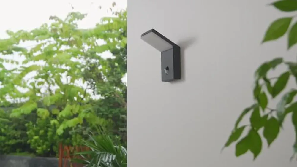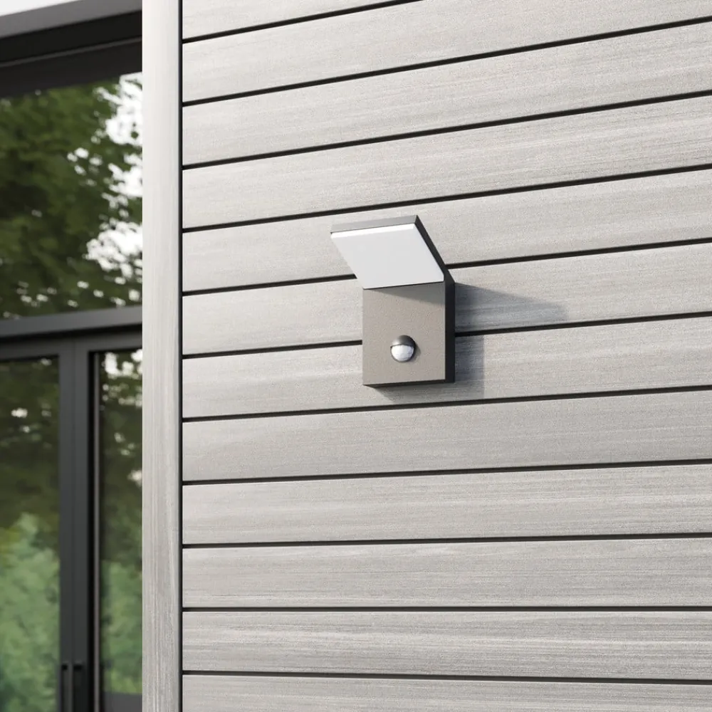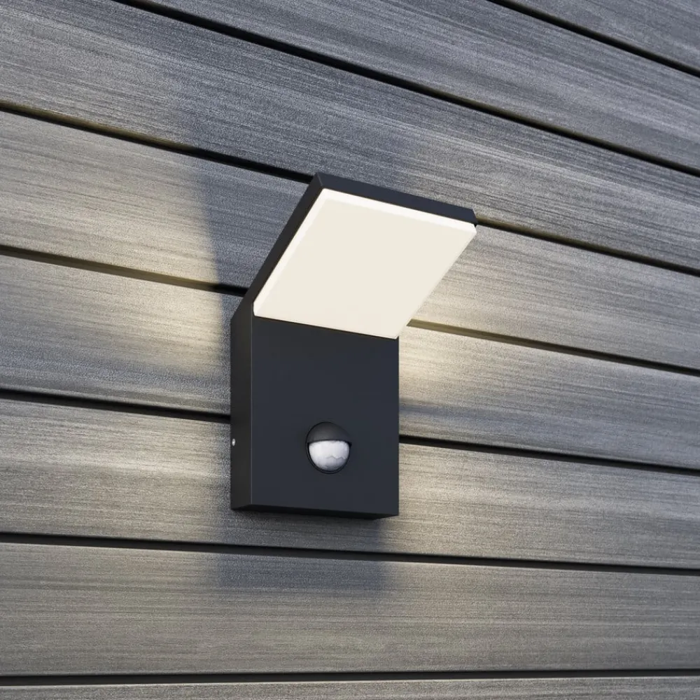 Nevio LED-væglampe med hældning nedad til moderne udendørs belysning Denne udendørs LED-væglampe udsender lys nedad, da det rektangulære lampehoved hælder mod jorden. Det passer perfekt til den rektangulære ramme og er på undersiden dækket af en hvid plastdiffusor, som skaber en ensartet og blændfri lyseffekt. De integrerede, varmhvide LED’er er et mærkevareprodukt fra Epistar og udmærker sig ikke kun ved en lang levetid, men også ved en høj energieffektivitet, hvilket er helt i tråd med moderne miljøbevidsthed. Armaturet har også en integreret bevægelsessensor, som sikrer, at belysningen tilpasser sig omgivelserne, når den tændes og slukkes, og derefter tændes, når folk nærmer sig ejendommen og har brug for orienteringsbelysning – 120° registreringsvinkel – Maks. rækkevidde 9 m – Belysningstid justerbar fra 5 sekunder til 8 minutter