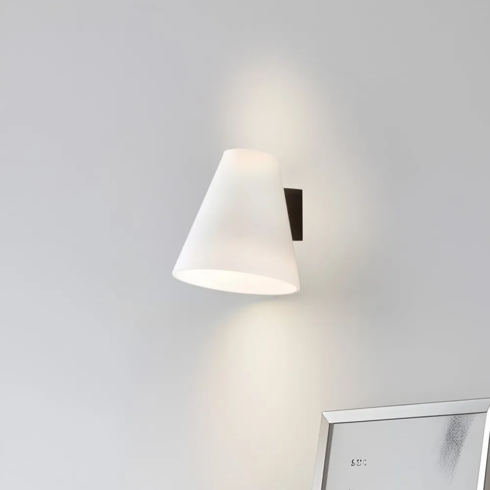 Med glasskærm – Timido-væglampen Med sin hvide glasskærm skaber Timido-væglampen en hyggelig atmosfære i ethvert rum. Uanset om det er i stuen, soveværelset eller gangen – det blændfrie lys skaber en behagelig atmosfære. Den koniske skærm er åben foroven og forneden, hvilket skaber tiltalende lyskegler. Lysstyrken på en dæmpbar lyskilde kan justeres ved hjælp af en ekstern lysdæmper.
